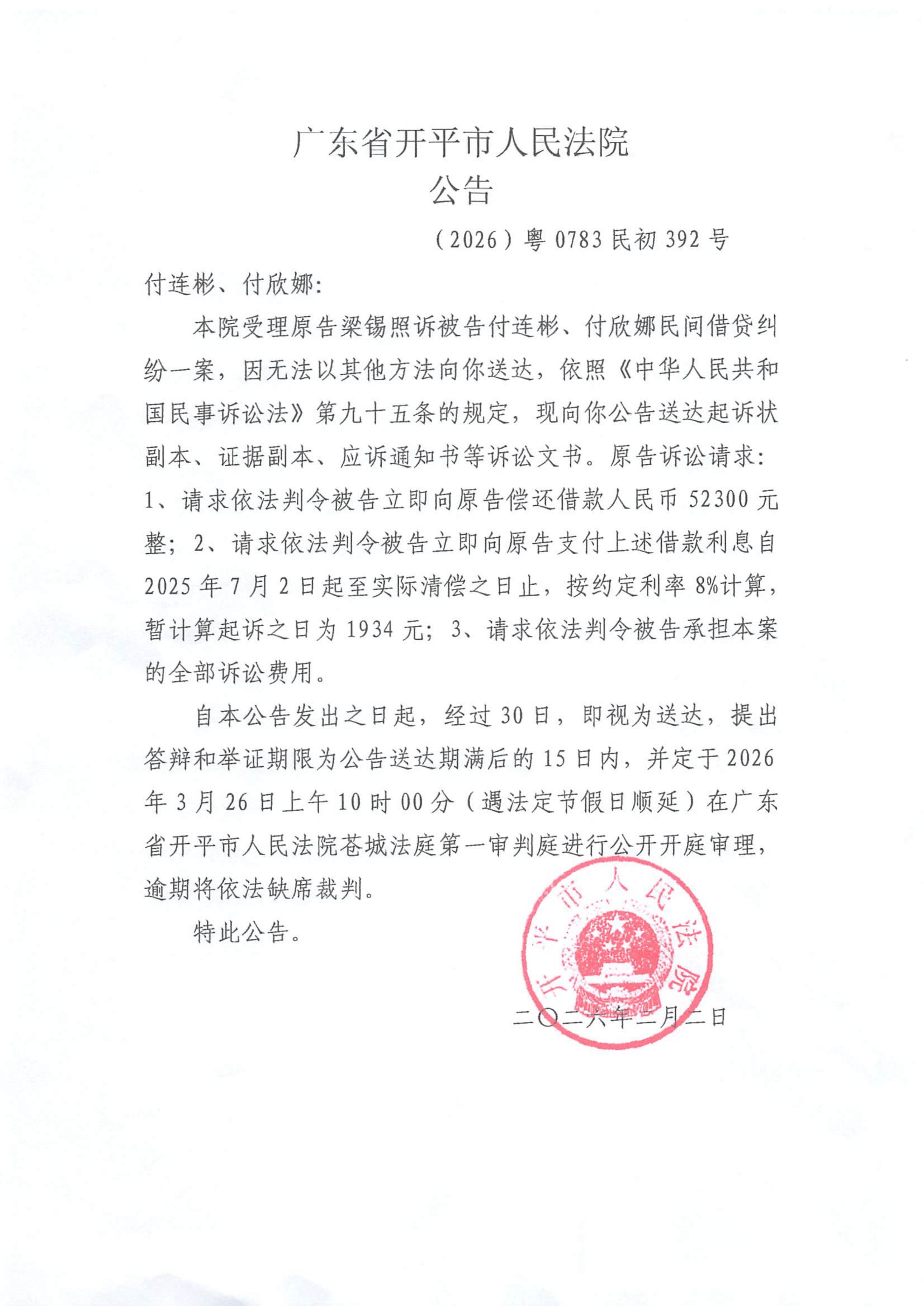 附件:(2026)粤0783民初392号 付连彬、付欣娜 开庭公告.pdf