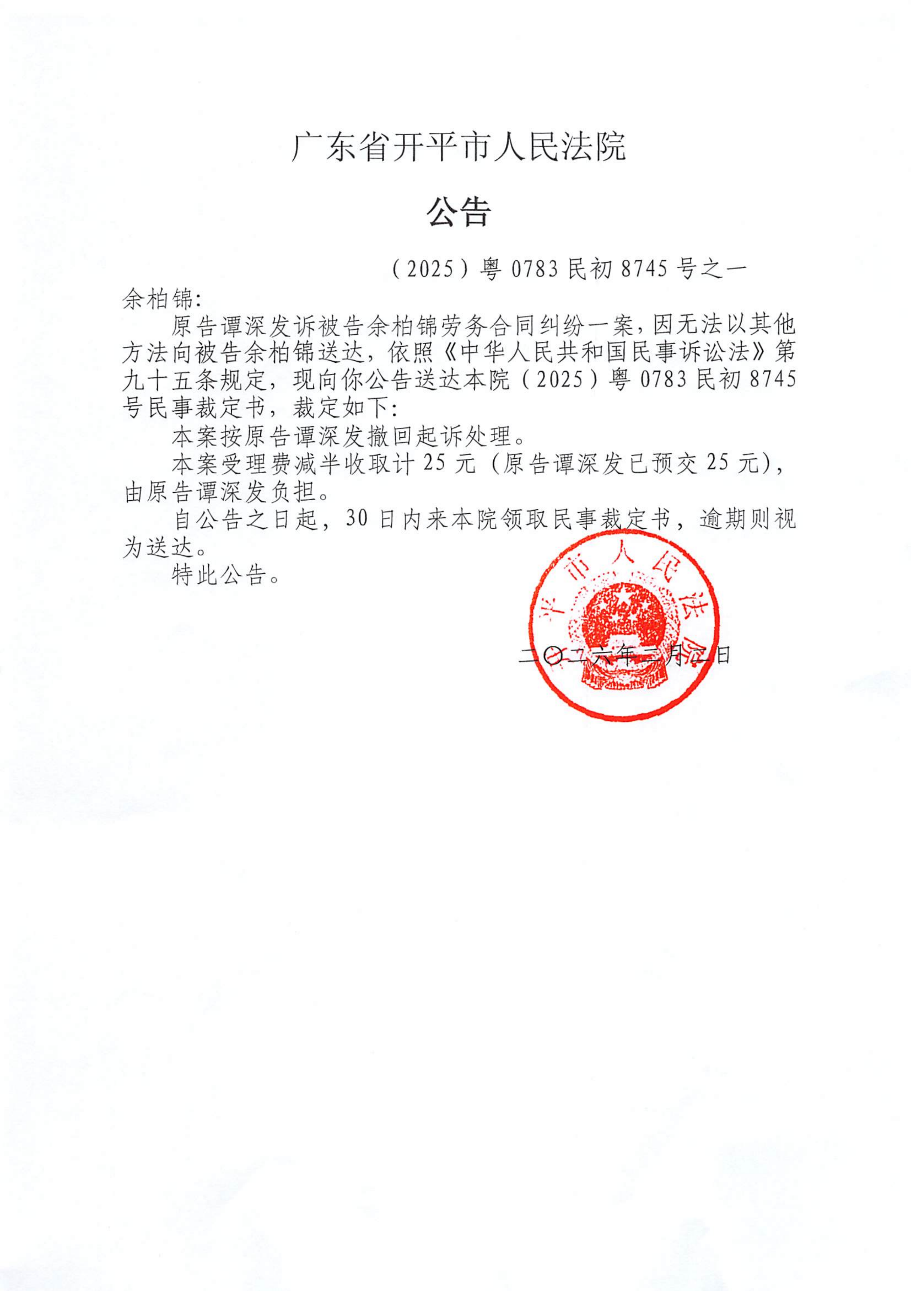 附件:(2025)粤0783民初8745号之一 余柏锦 裁定公告.pdf
