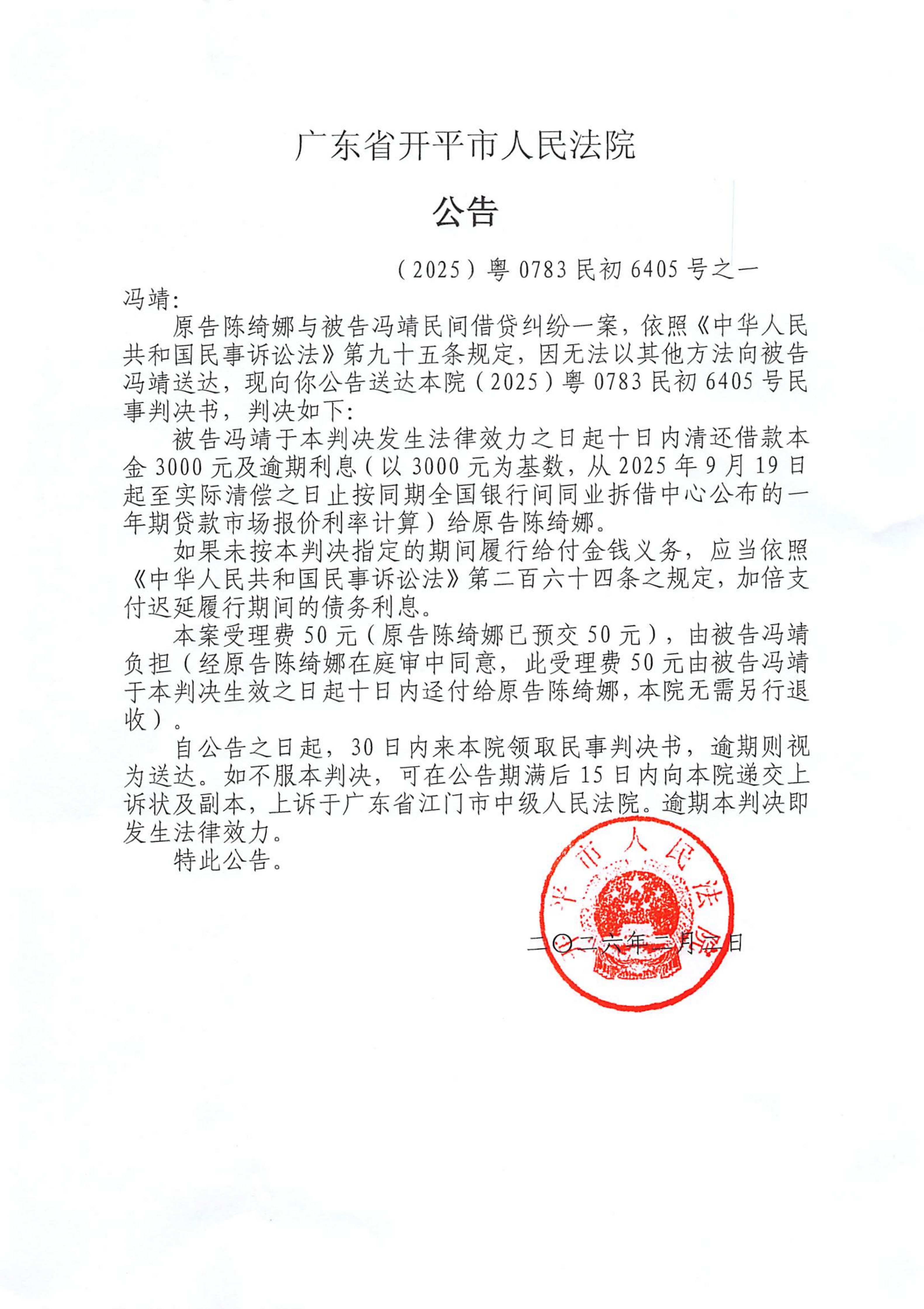 附件:(2025)粤0783民初6405号之一 冯靖 判决公告.pdf