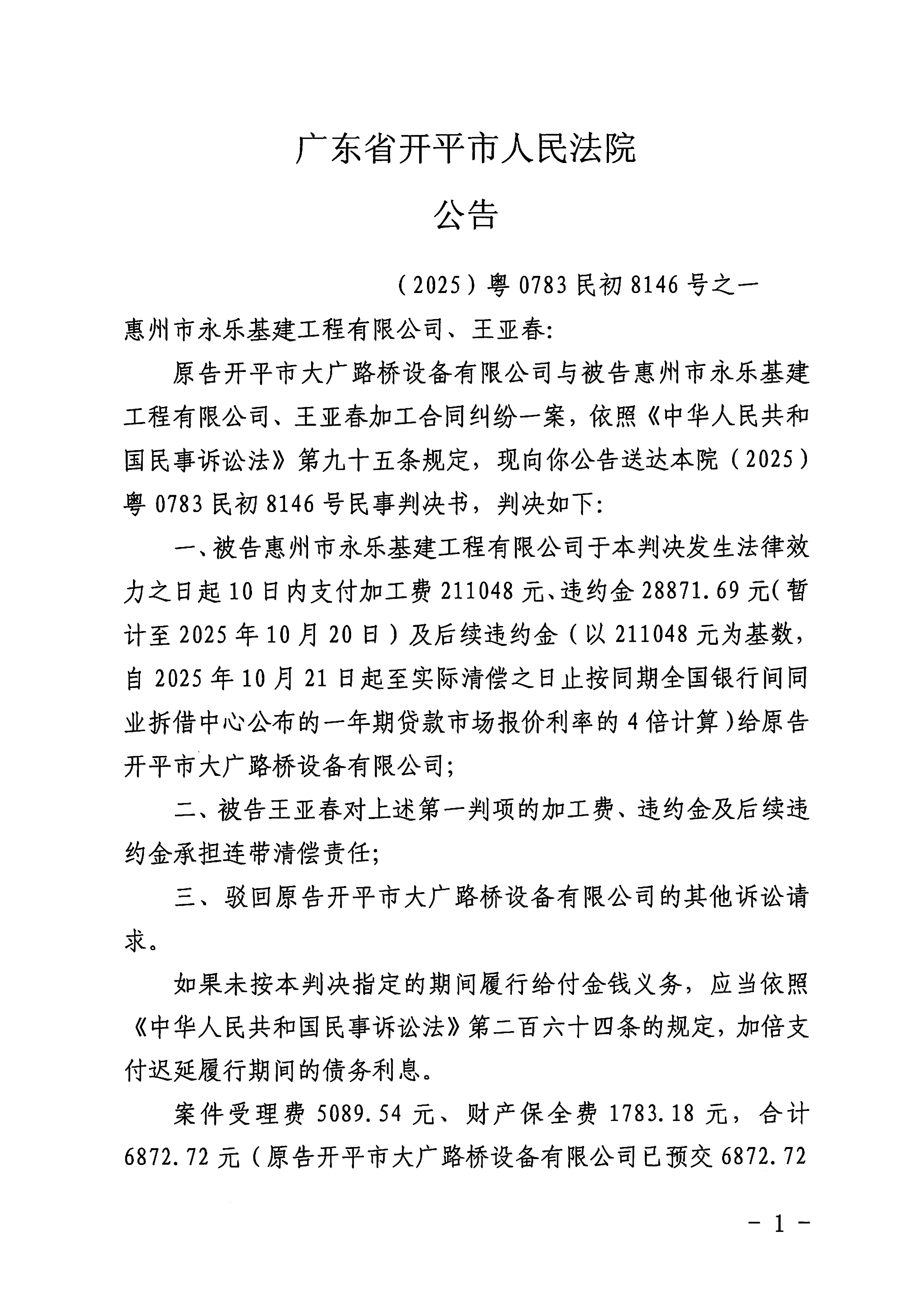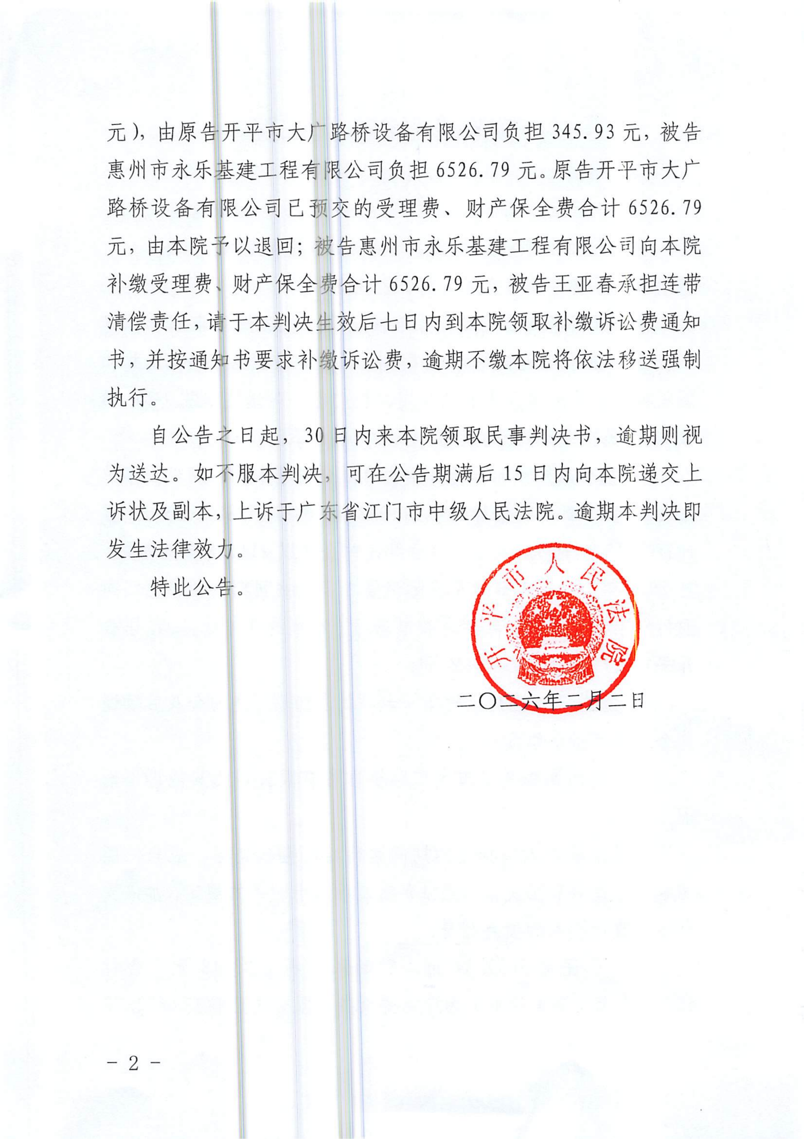 附件:(2025)粤0783民初8146号之一 惠州市永乐基建工程有限公司、王亚春 判决公告.pdf
