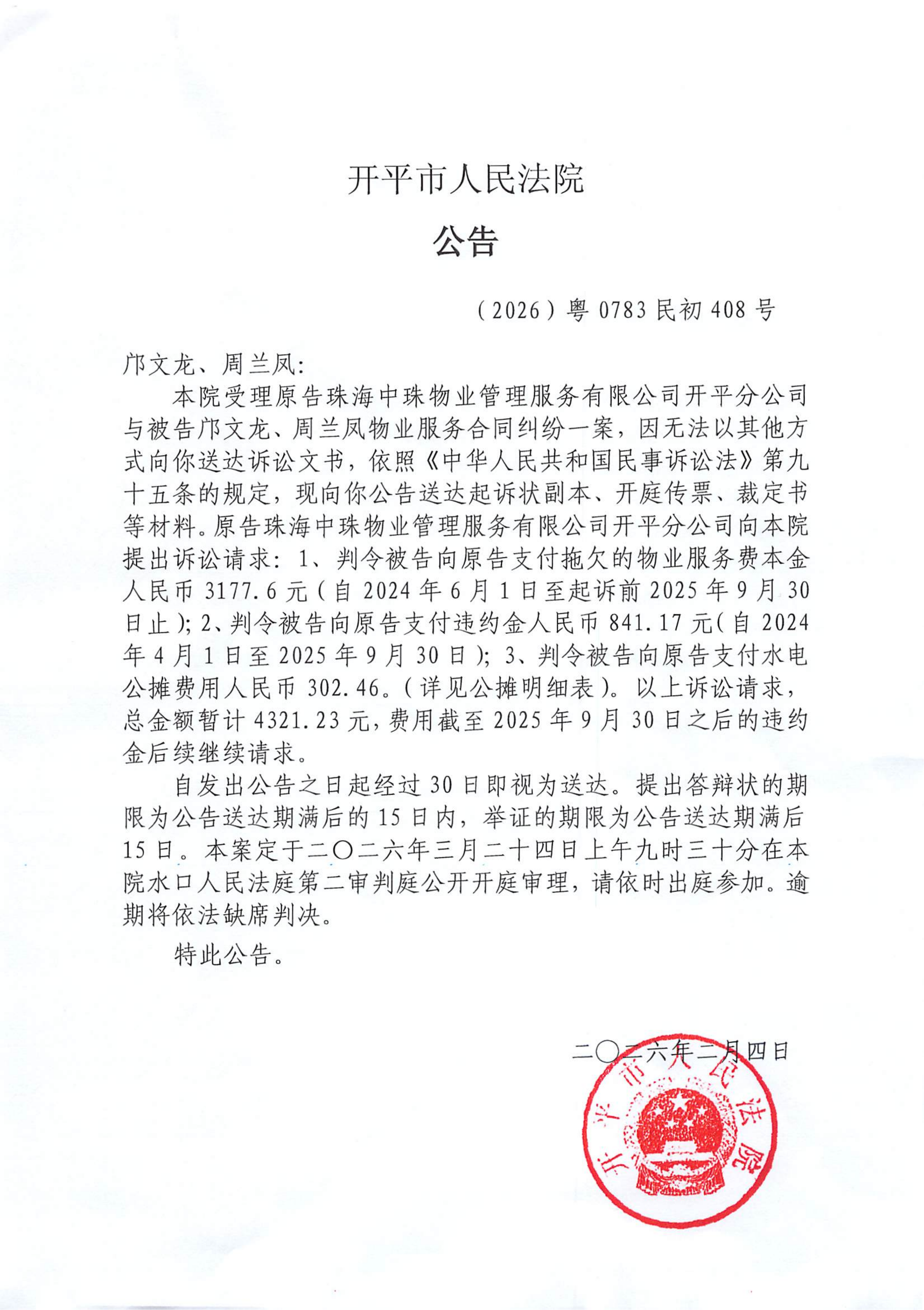 附件:(2026)粤0783民初408号 邝文龙、周兰凤 开庭公告.pdf