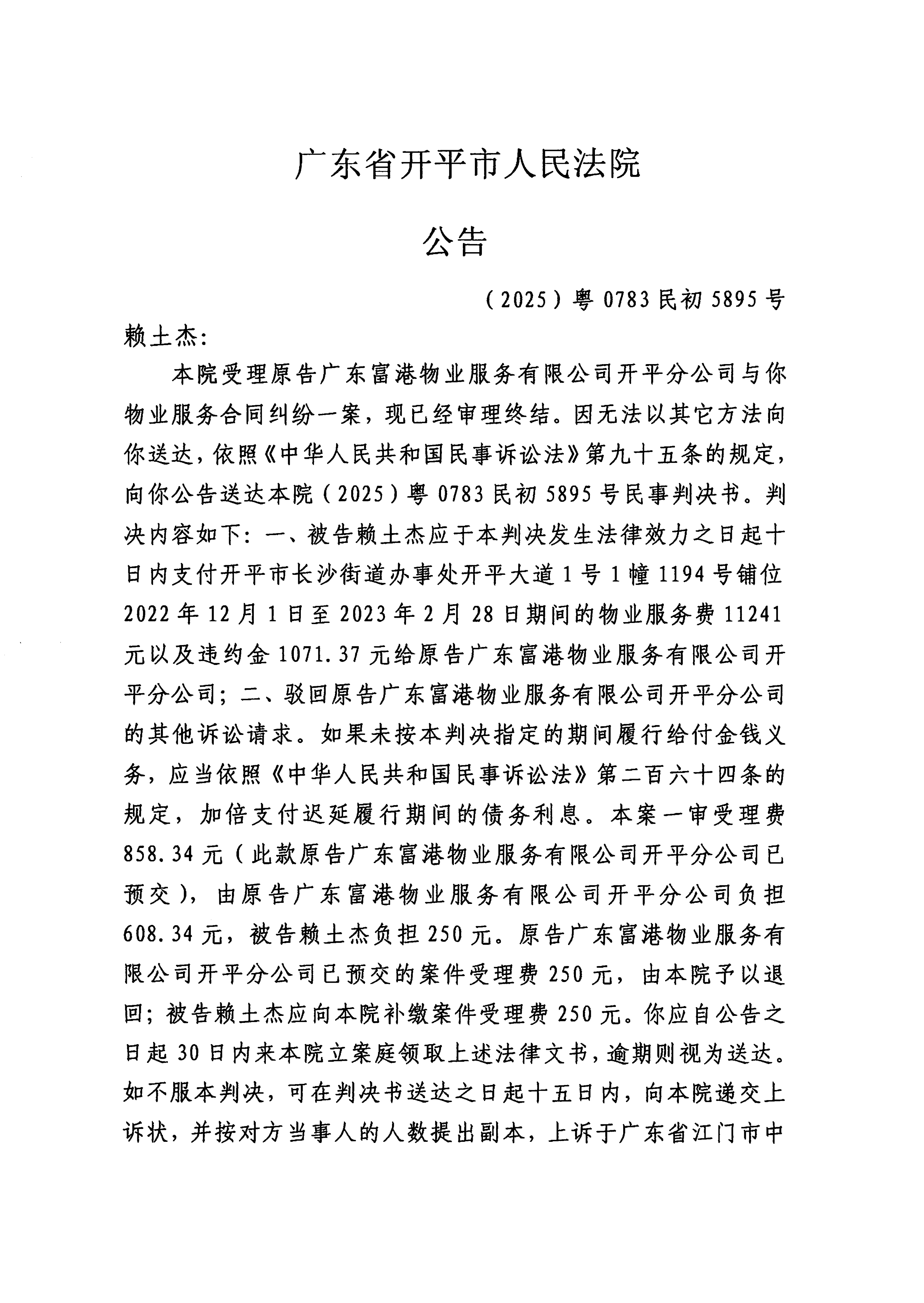 附件:(2025)粤0783民初5895号 赖土杰 判决公告.pdf