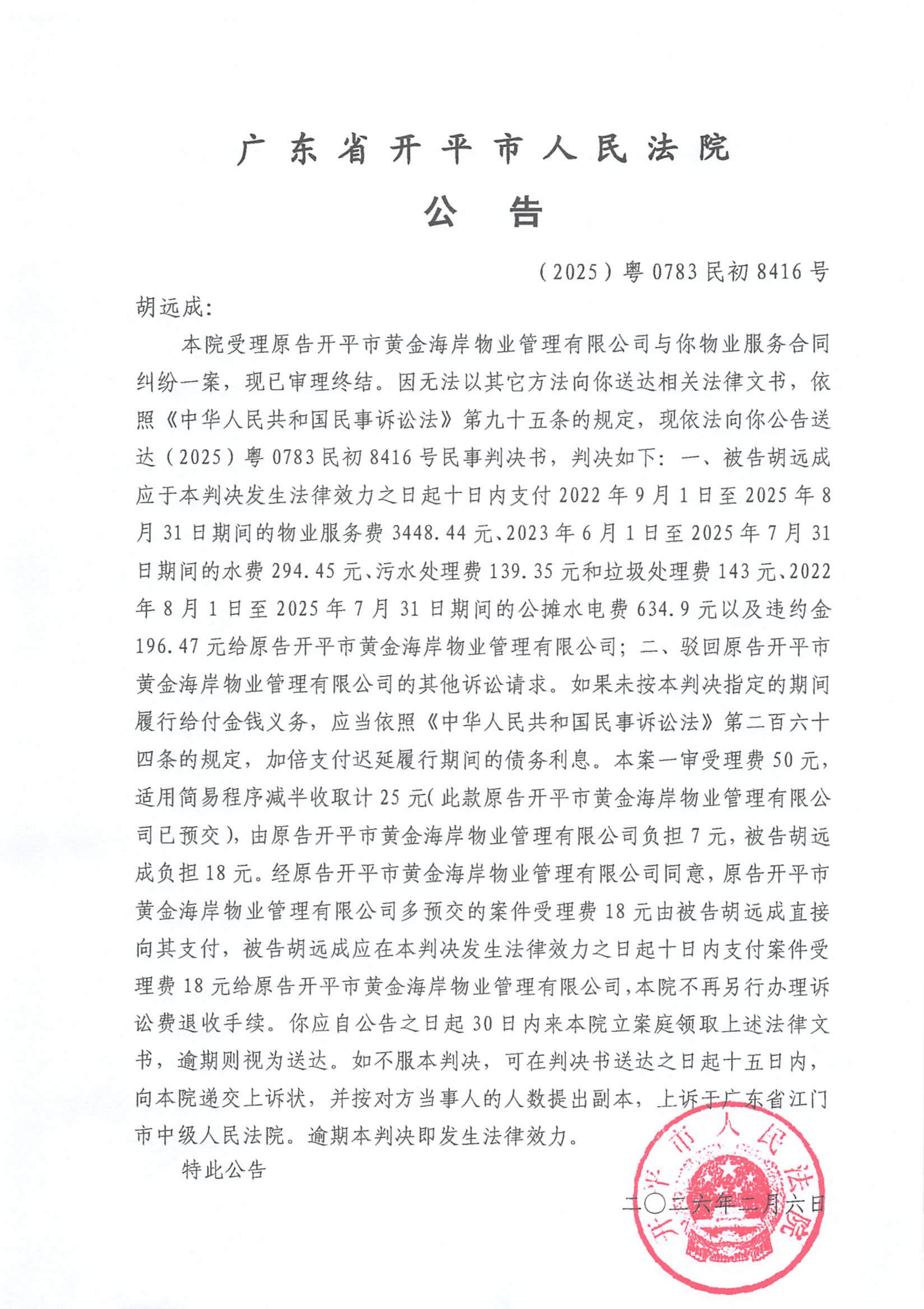 附件:(2025)粤0783民初8416号 胡远成 判决公告.pdf