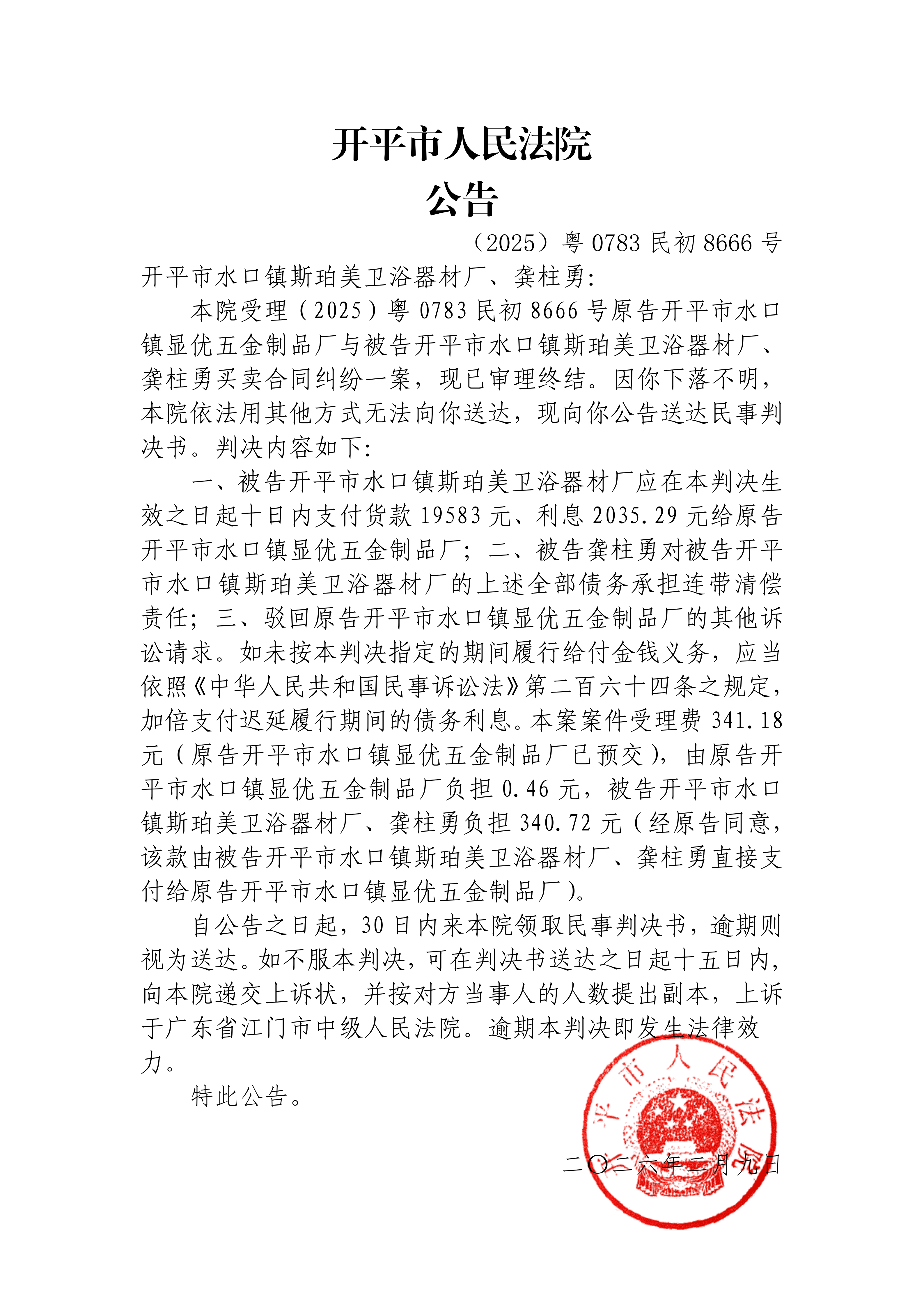 附件:(2025)粤0783民初8666号 开平市水口镇斯珀美卫浴器材厂、龚柱勇 判决公告.pdf