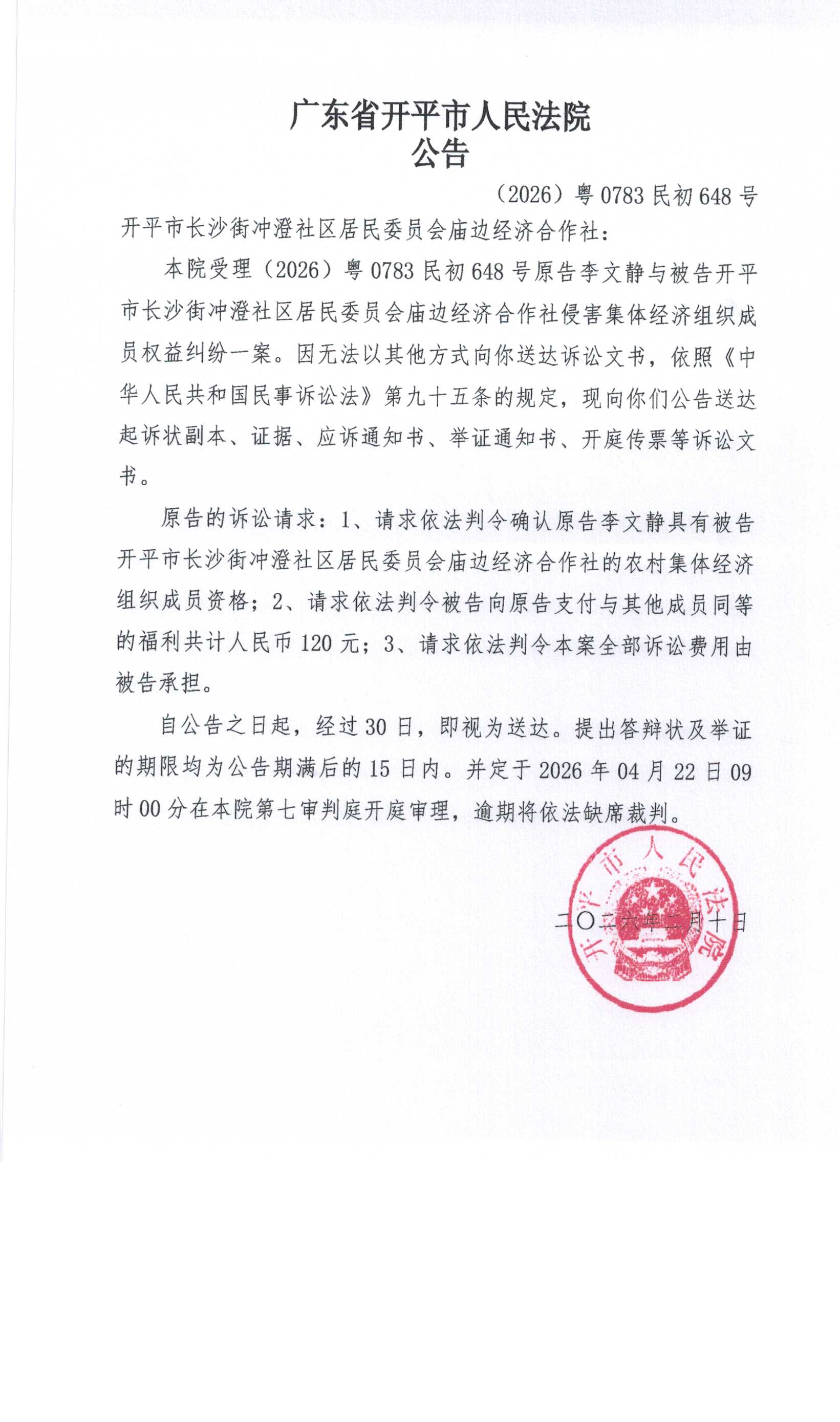 (2026)粤0783民初648号 开平市长沙街冲澄社区居民委员会庙边经济合作社 应诉公告.pdf