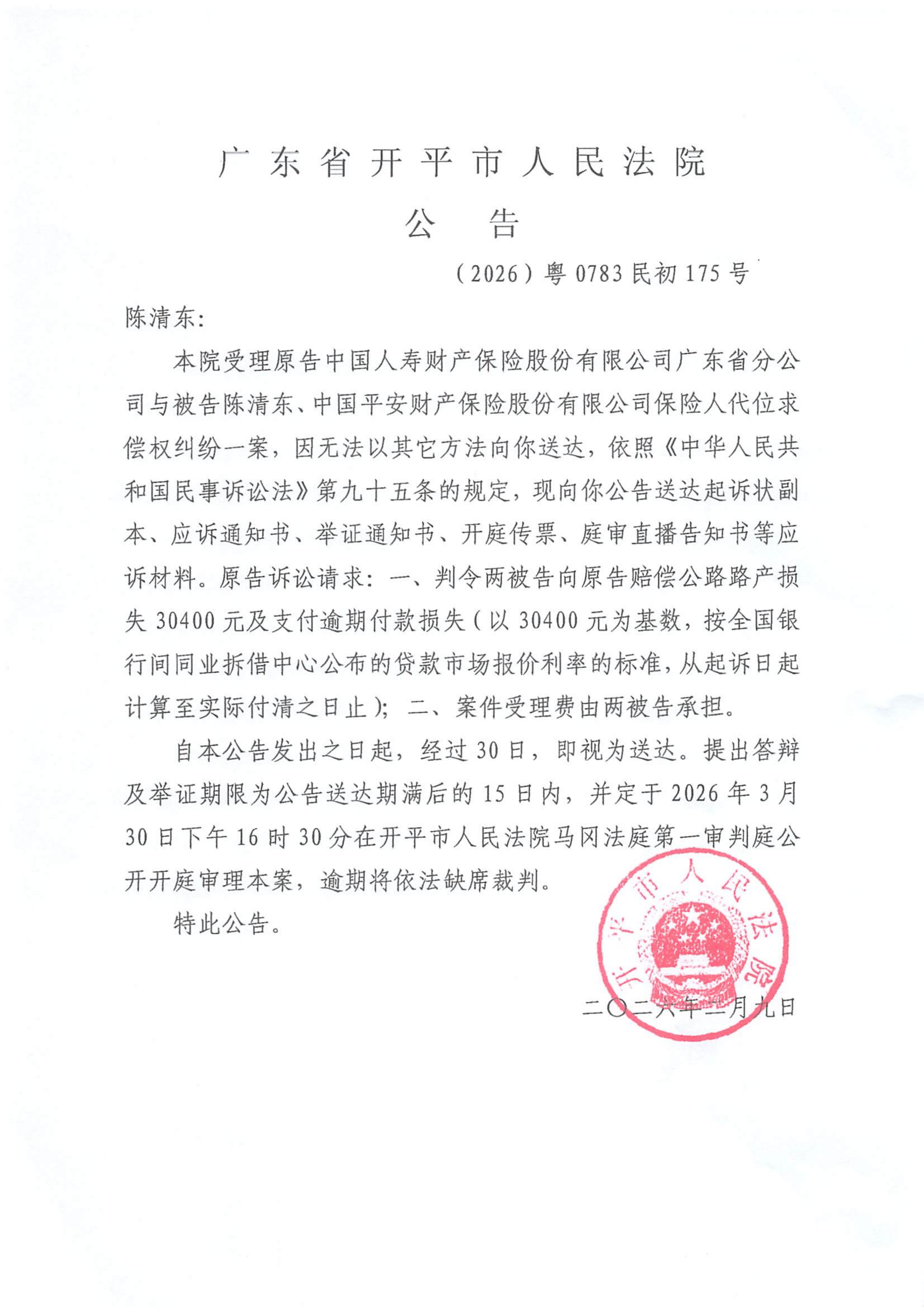 附件:(2026)粤0783民初175号 陈清东 开庭公告.pdf