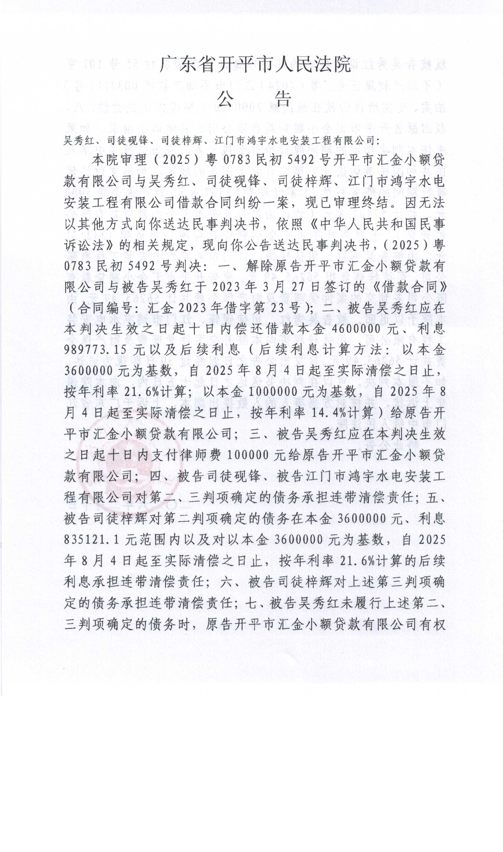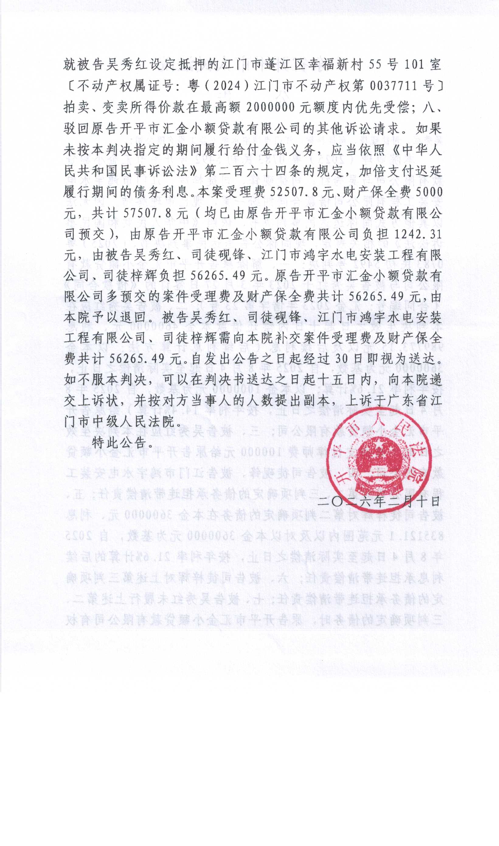 (2025)粤0783民初5492号判决公告吴秀红、司徒砚锋、司徒梓辉、江门市鸿宇水电安装工程有限公司判决公告.pdf