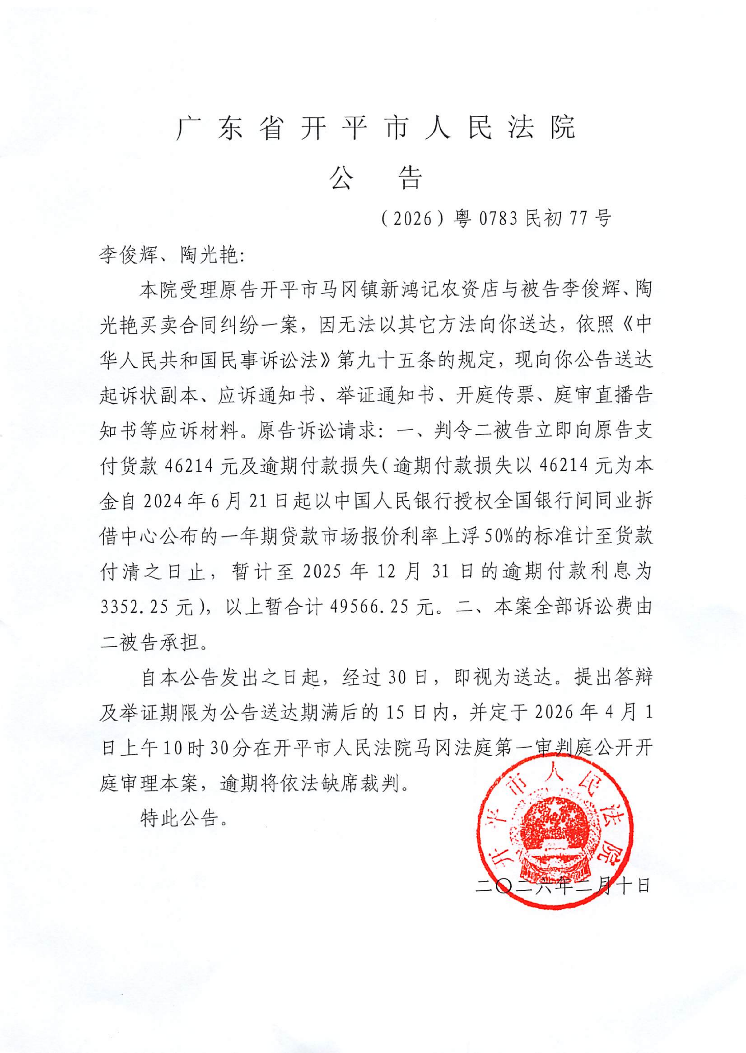附件:(2026)粤0783民初77号 李俊辉、陶光艳 开庭公告.pdf