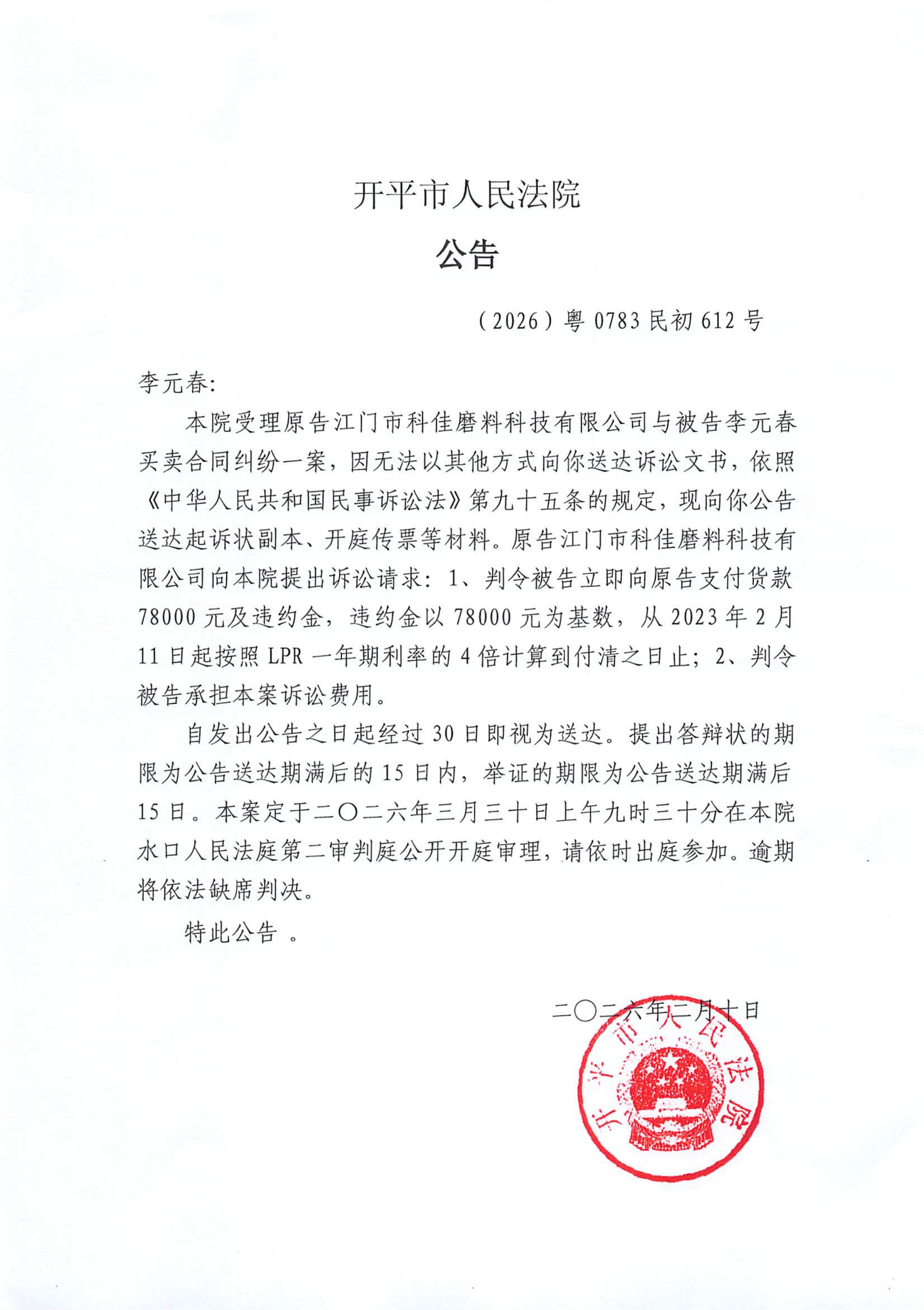 附件:(2026)粤0783民初612号 李元春 开庭公告.pdf