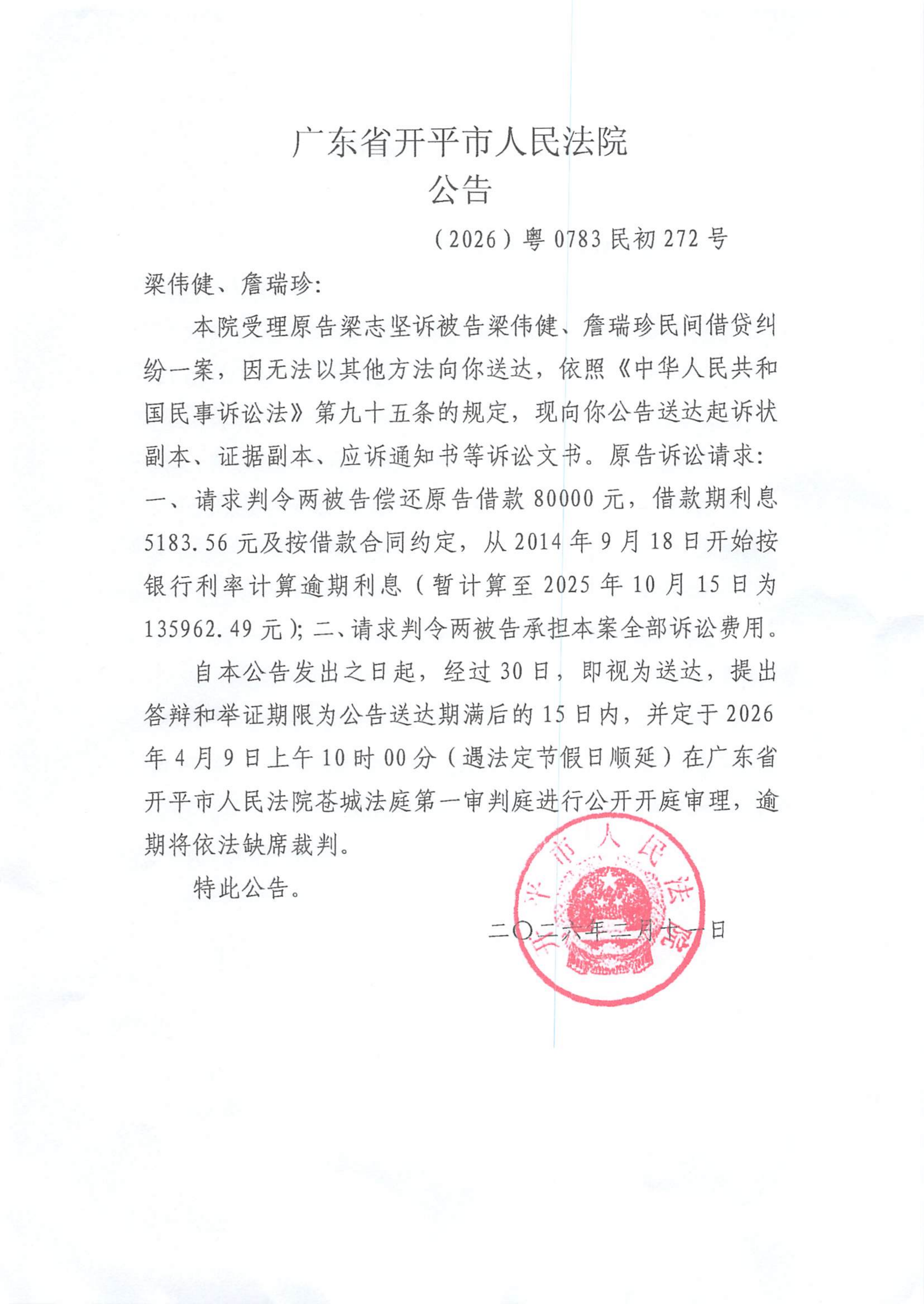 附件:(2026)粤0783民初272号 梁伟健、詹瑞珍 开庭公告.pdf