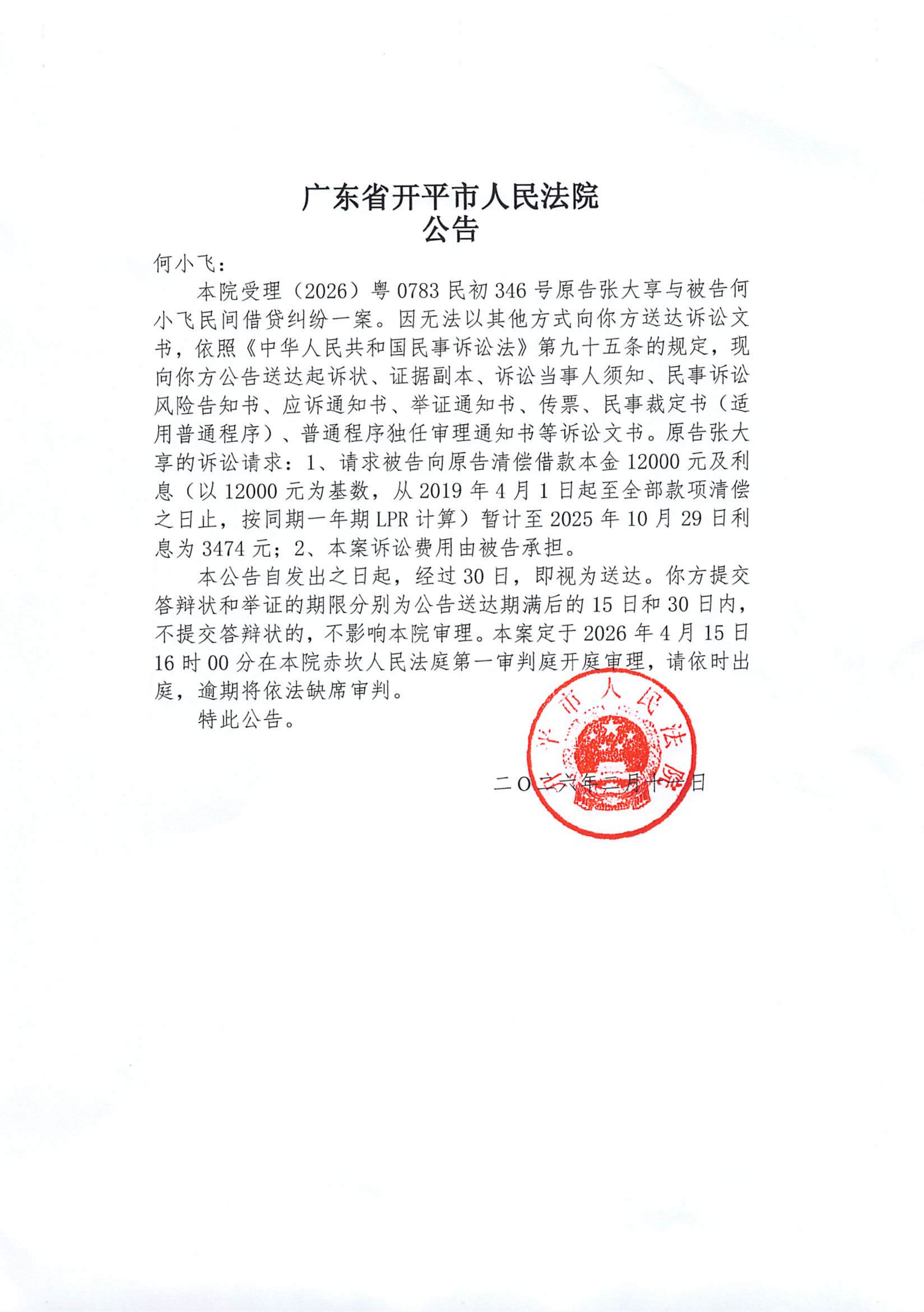 附件:(2026)粤0783民初346号 何小飞 开庭公告.pdf