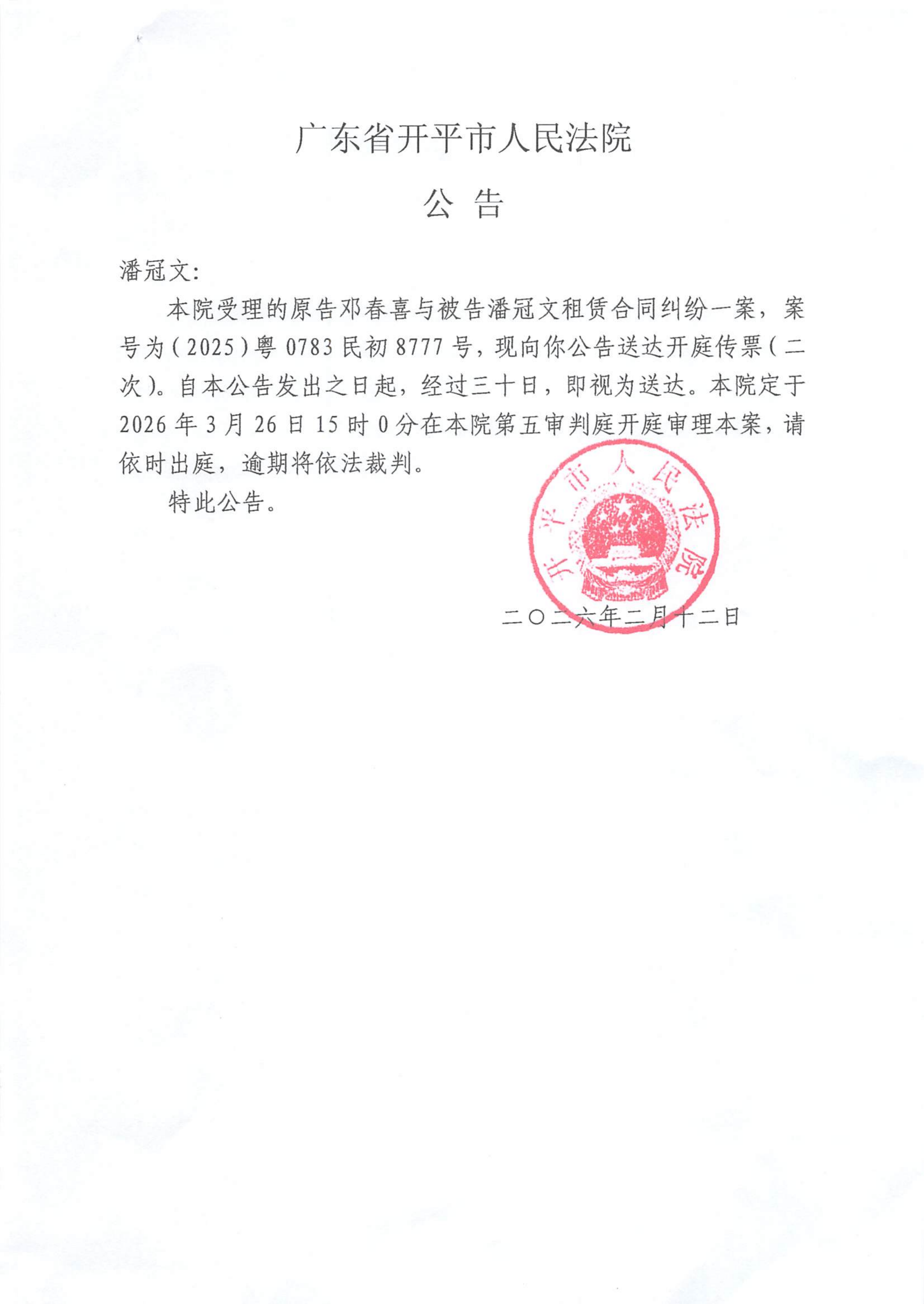 附件:(2025)粤0783民初8777号 潘冠文 开庭公告.pdf