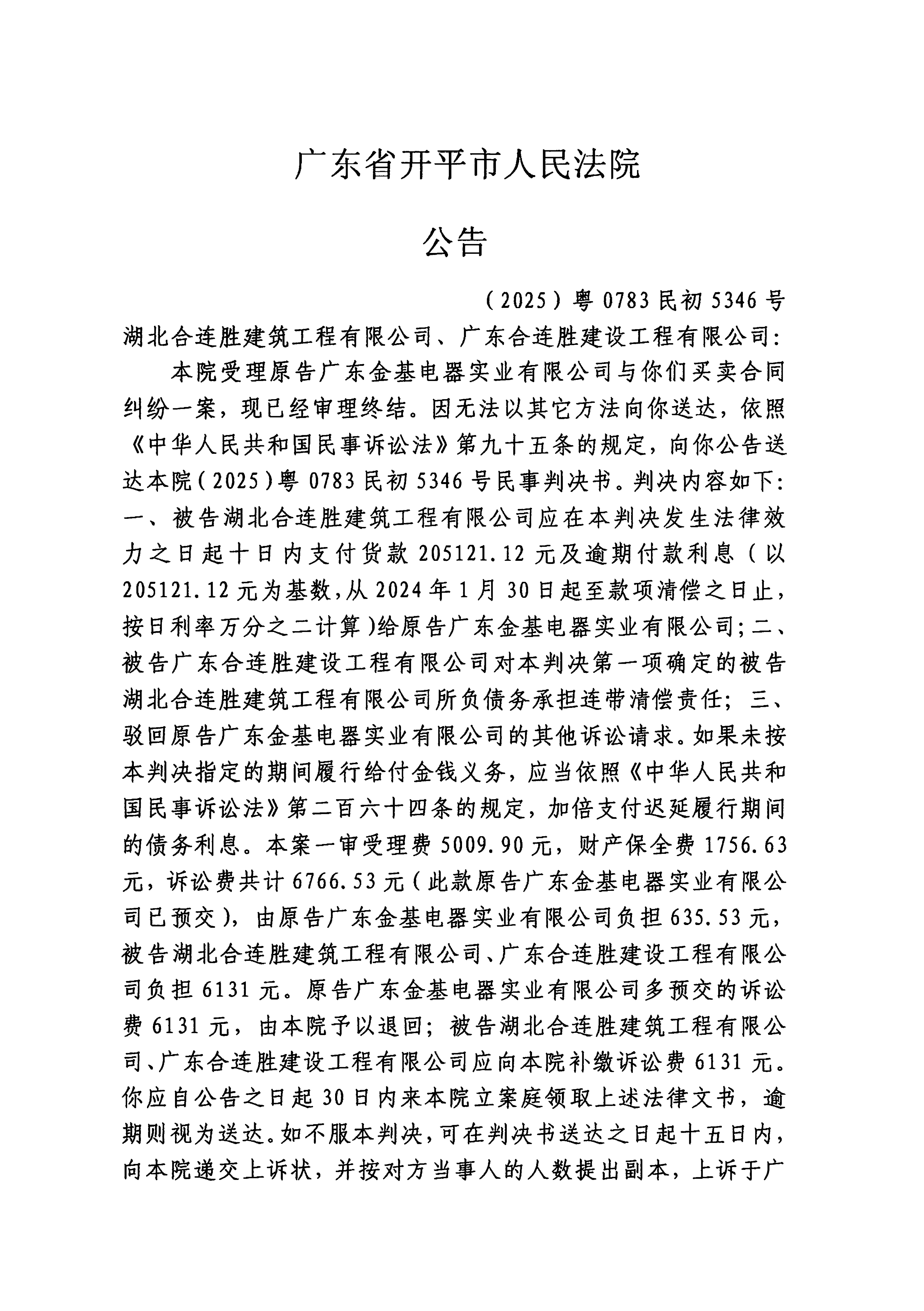 附件:(2025)粤0783民初5346号 湖北合连胜建筑工程有限公司、广东合连胜建设工程有限公司 判决公告.pdf