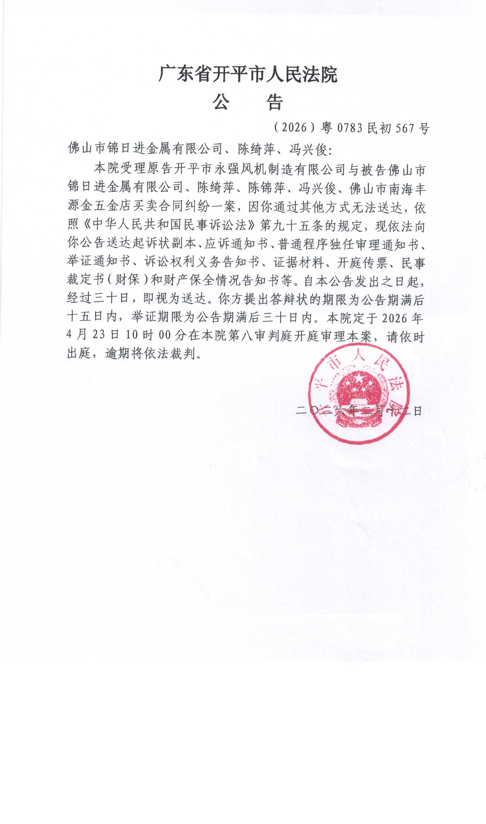 (2026)粤0783民初567号佛山市锦日进金属有限公司、陈绮萍、冯兴俊传票公告