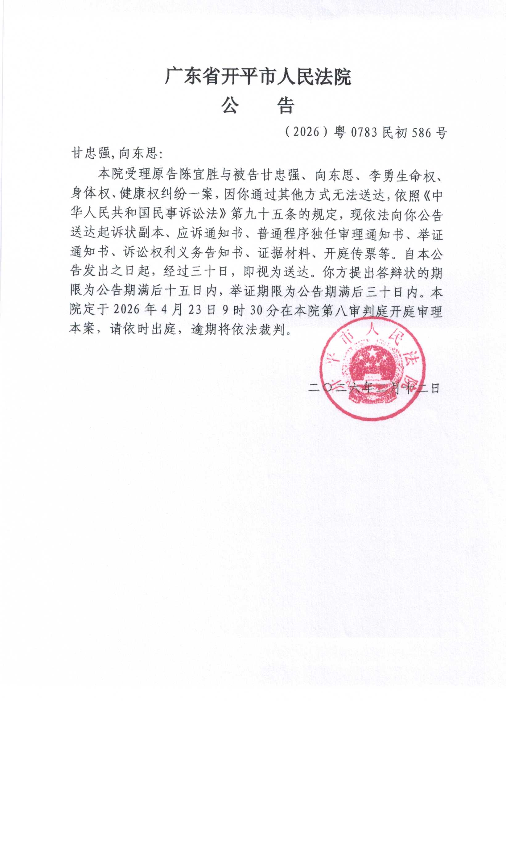 (2026)粤0783民初586号甘忠强、向东思传票公告