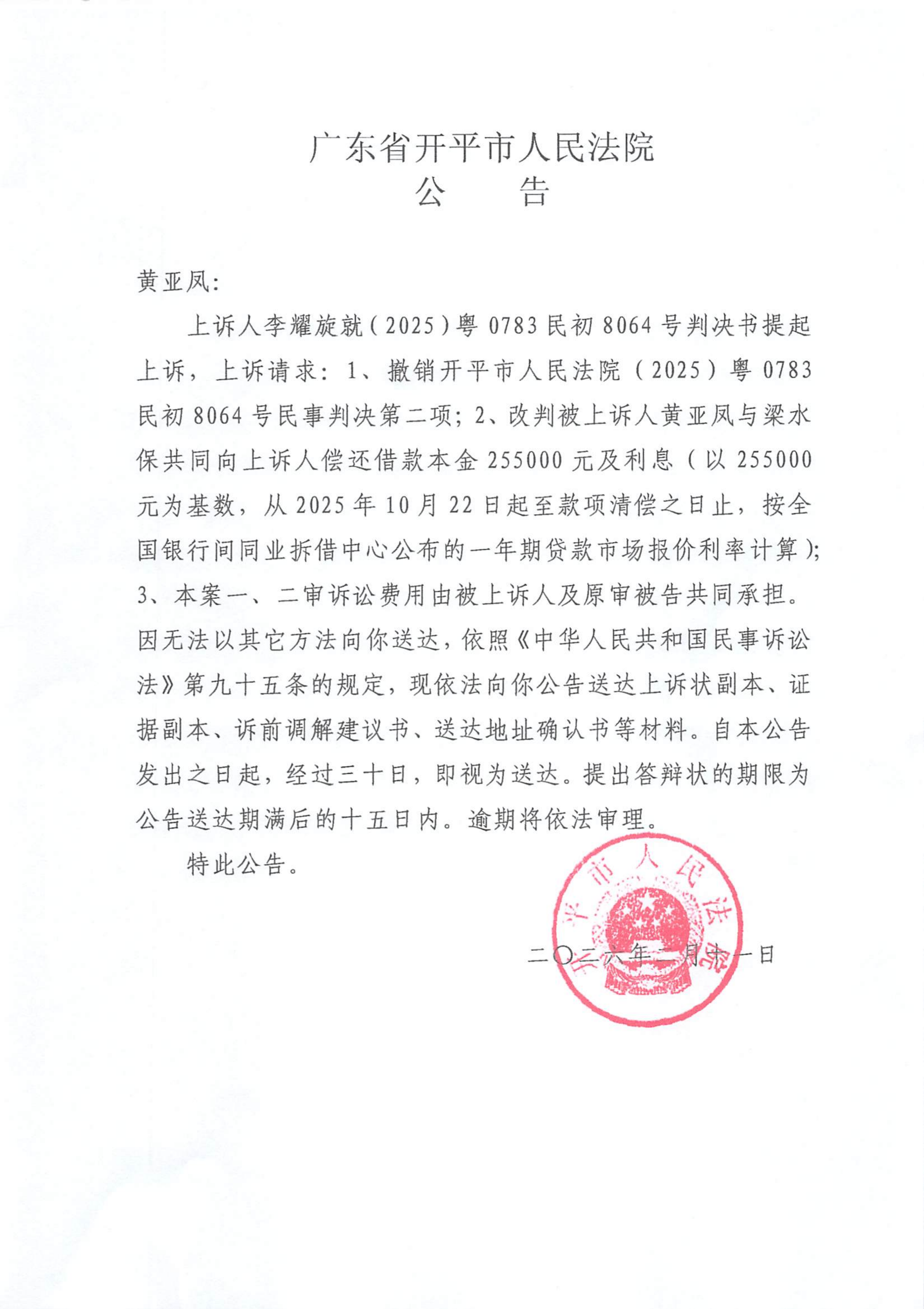 附件:(2025)粤0783民初8064号 黄亚凤 上诉公告.pdf