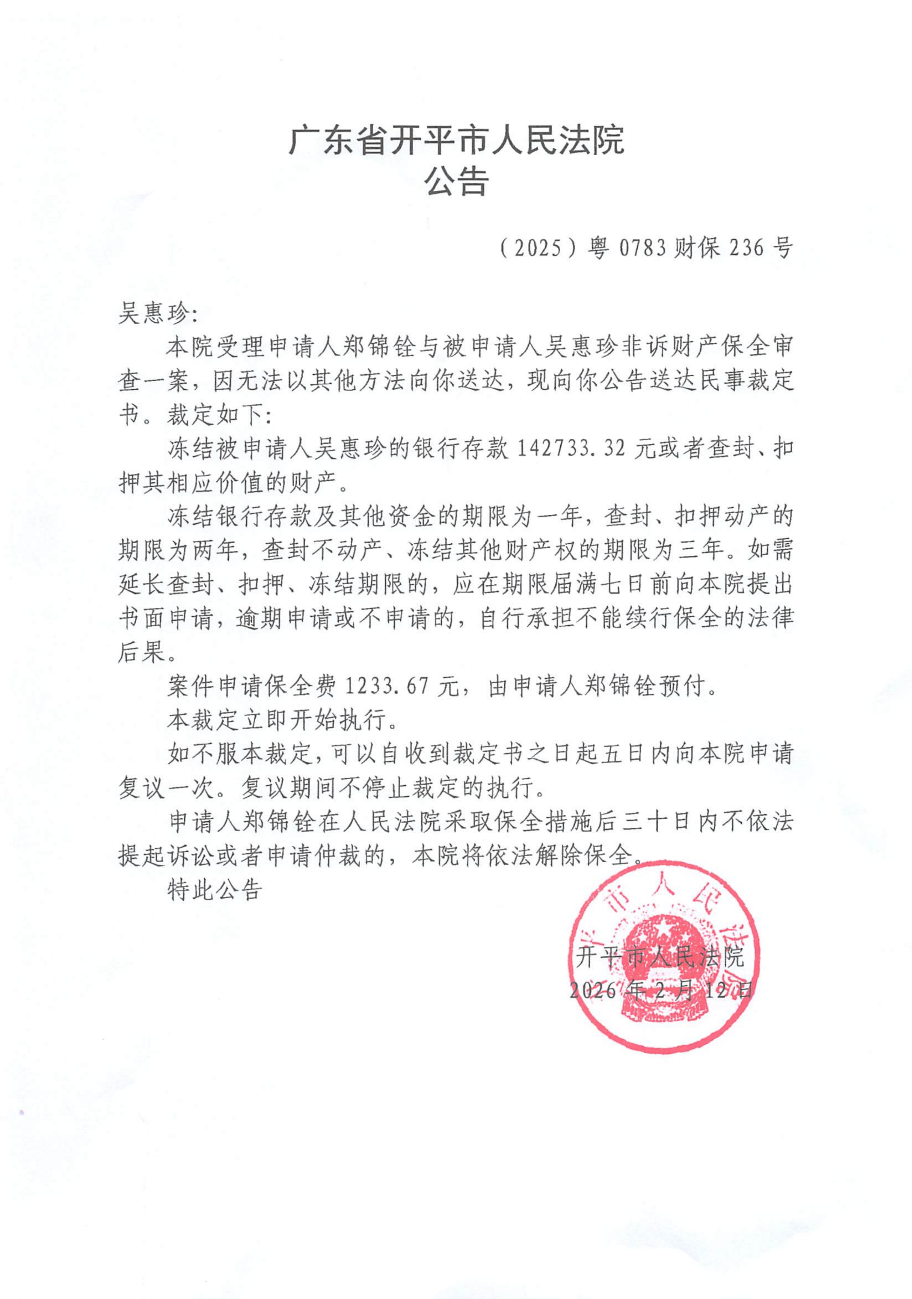 附件:(2025)粤0783财保236号 吴惠珍 裁定公告.pdf