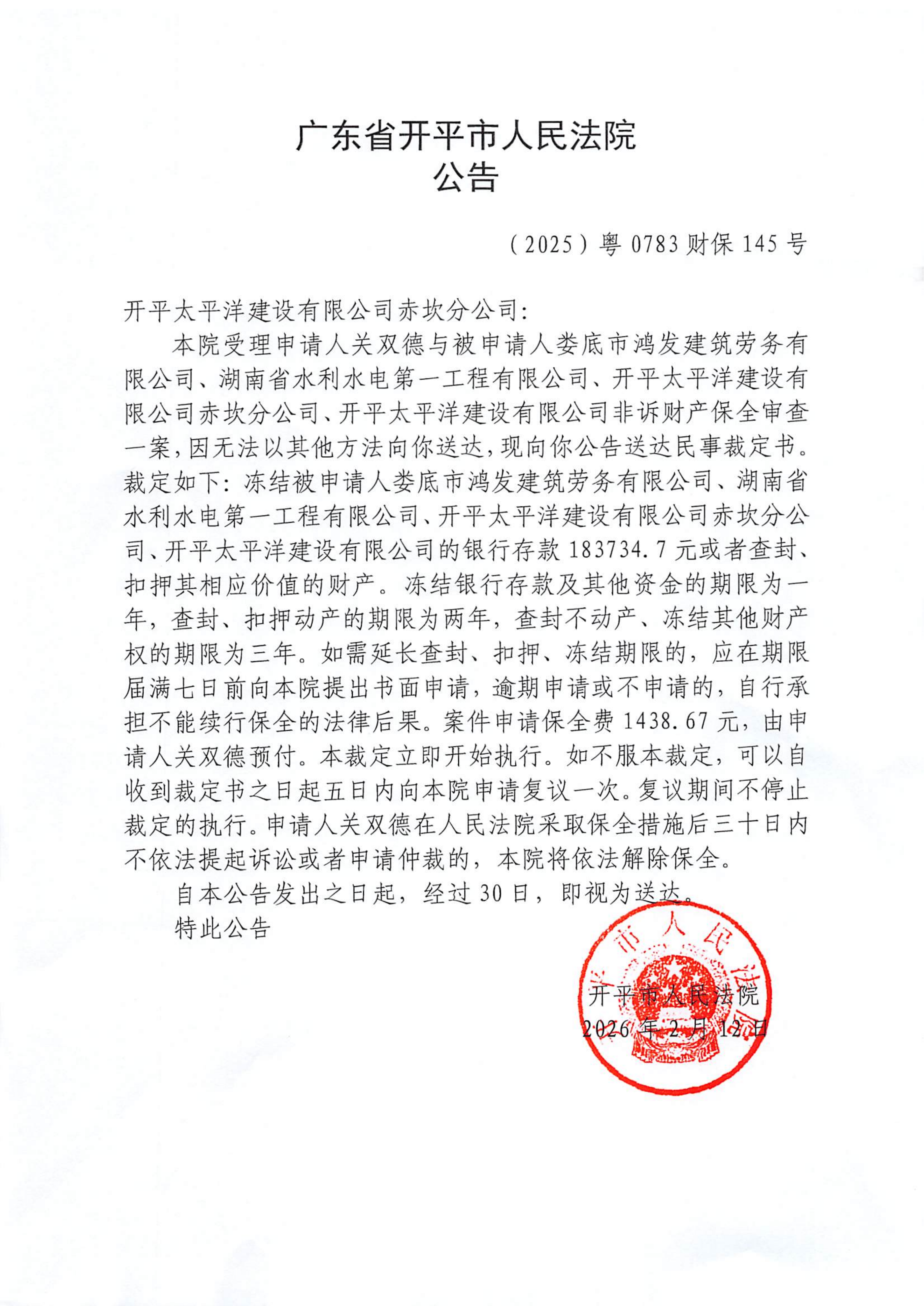 附件:(2025)粤0783财保145号 开平太平洋建设有限公司赤坎分公司 裁定公告.pdf