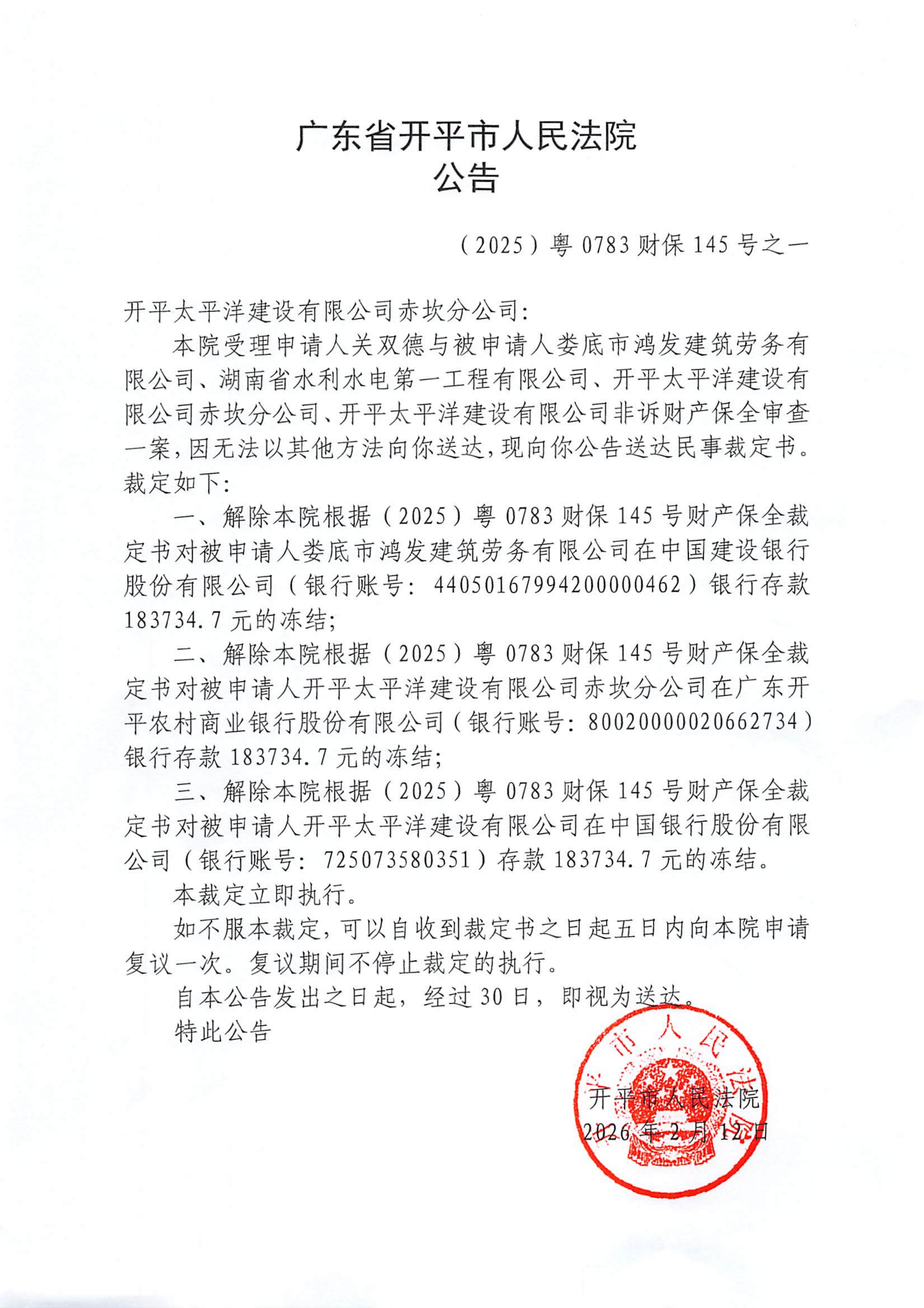 附件:(2025)粤0783财保145号之一 开平太平洋建设有限公司赤坎分公司 裁定公告.pdf