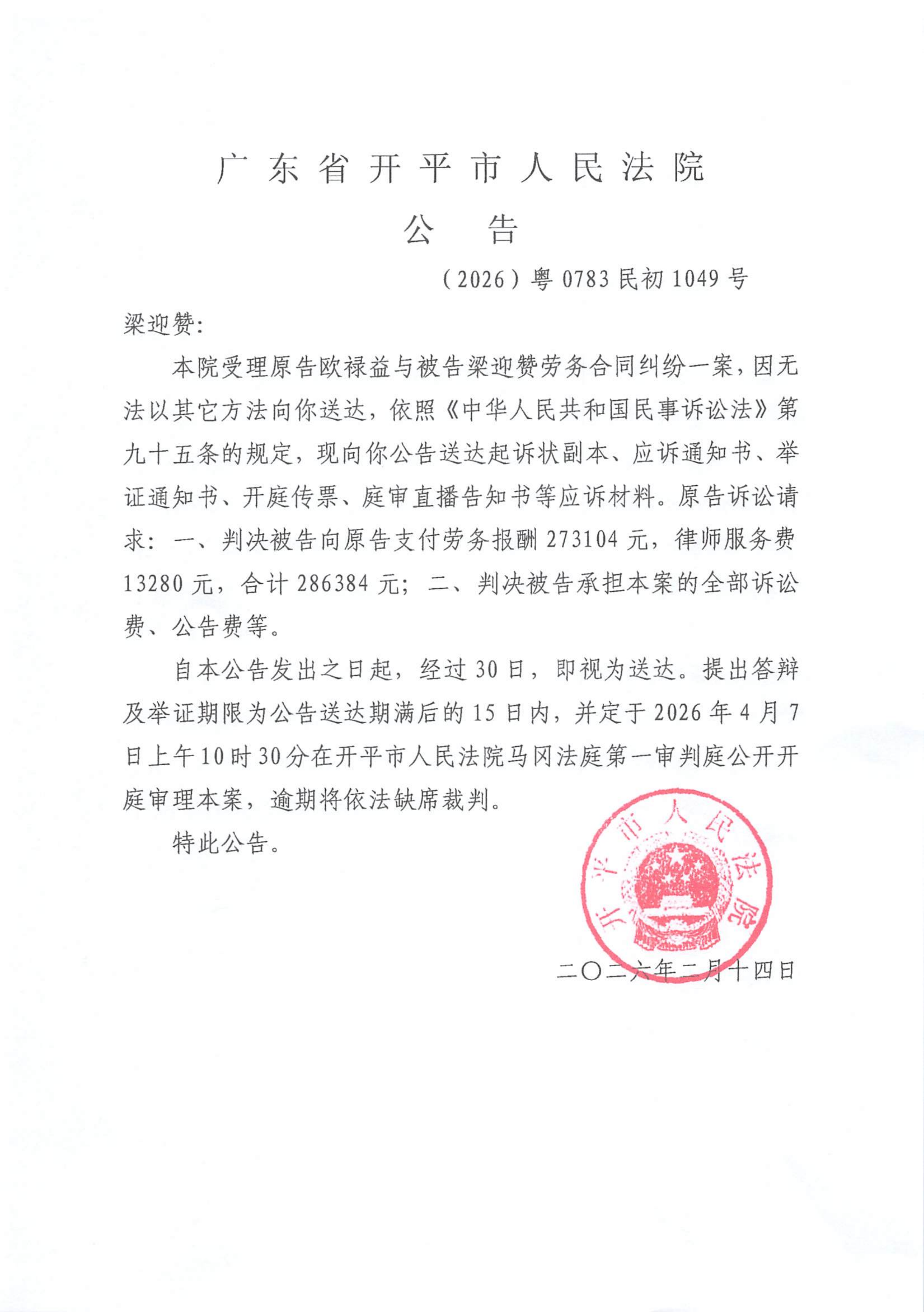 附件:(2026)粤0783民初1049号 梁迎赞 开庭公告.pdf