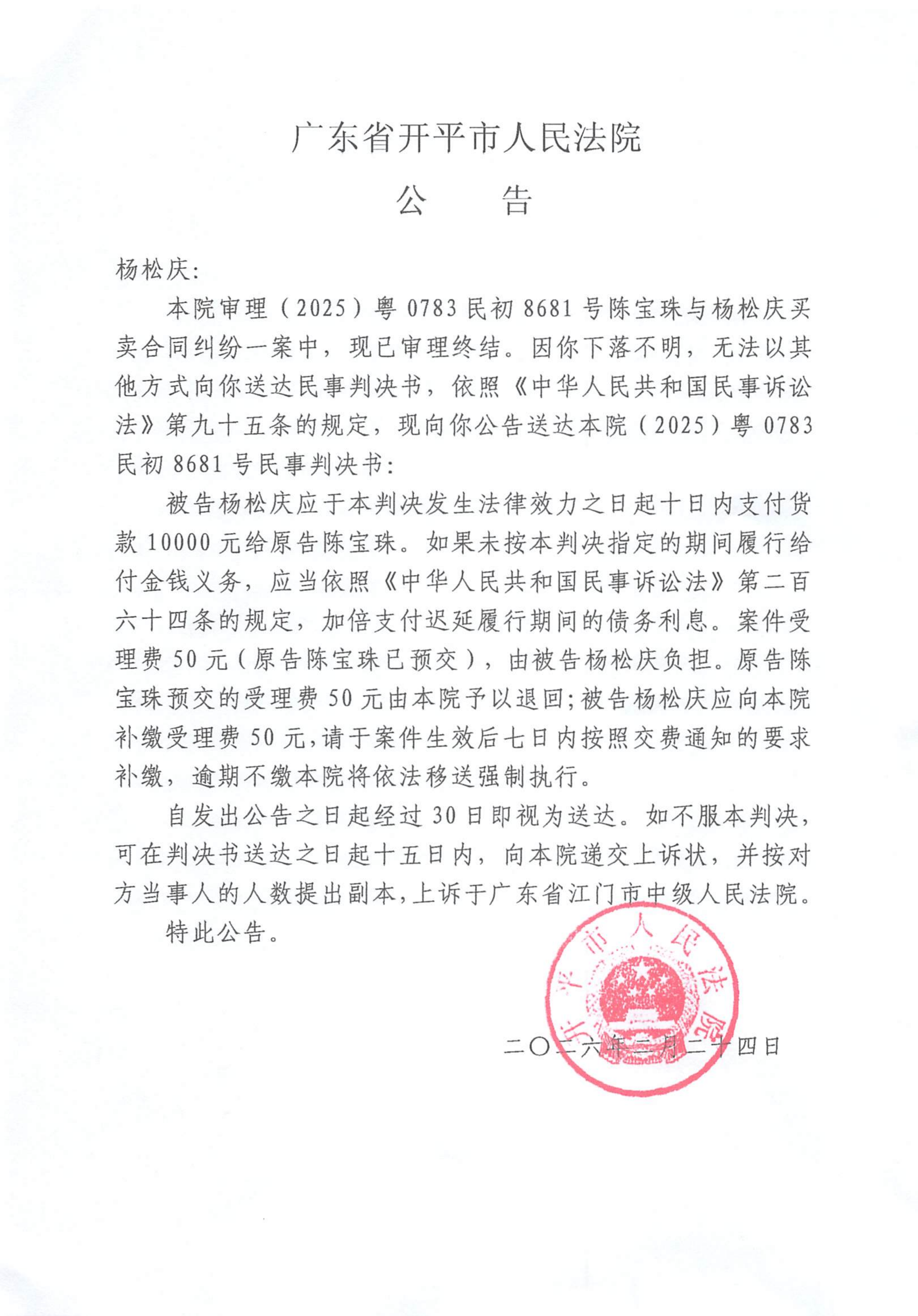 附件:(2025)粤0783民初8681号 杨松庆 判决公告.pdf
