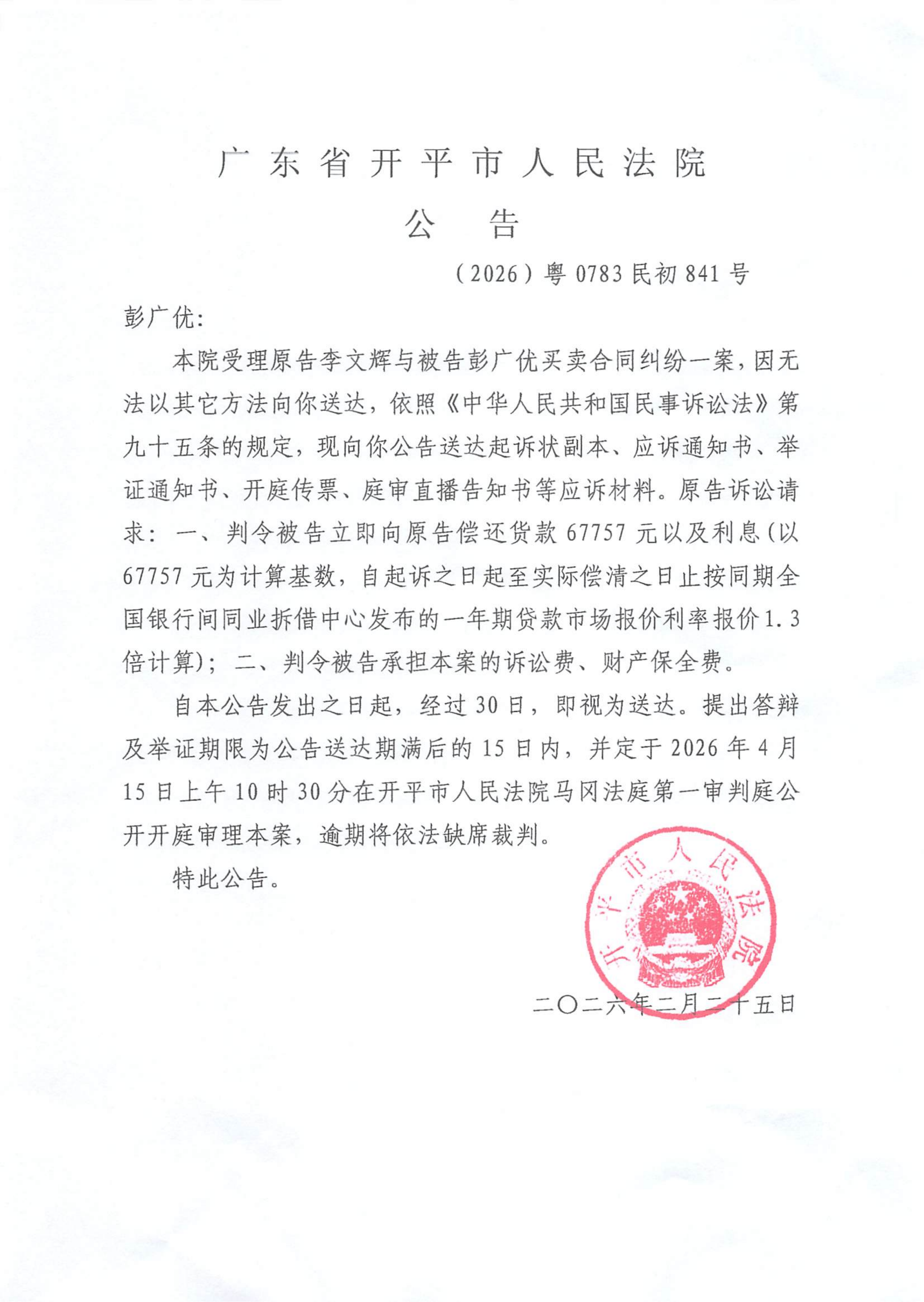 附件:(2026)粤0783民初841号 彭广优 开庭公告.pdf