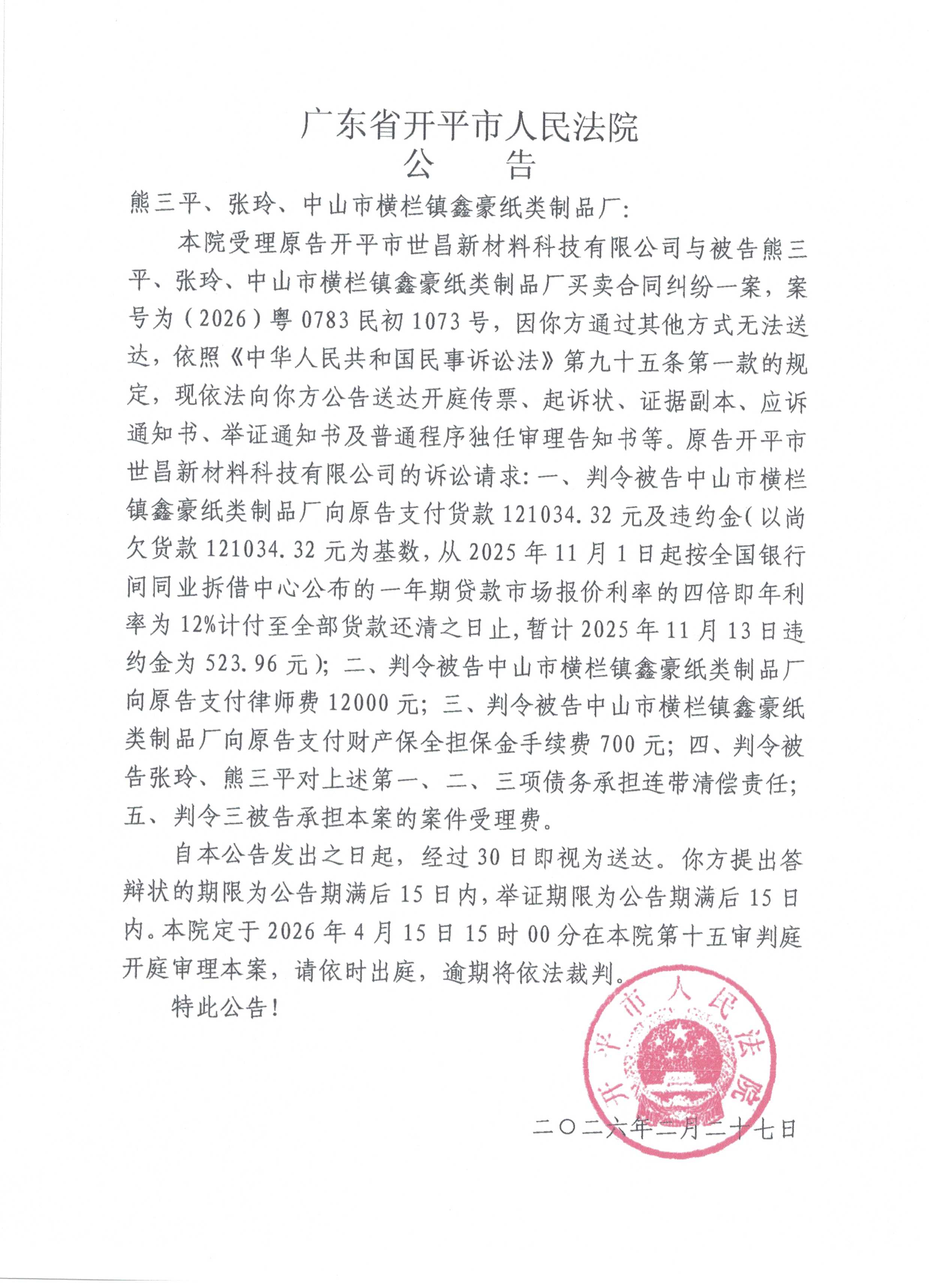 (2026)粤0783民初1073号 熊三平、张玲、中山市横栏镇鑫豪纸类制品厂 开庭公告