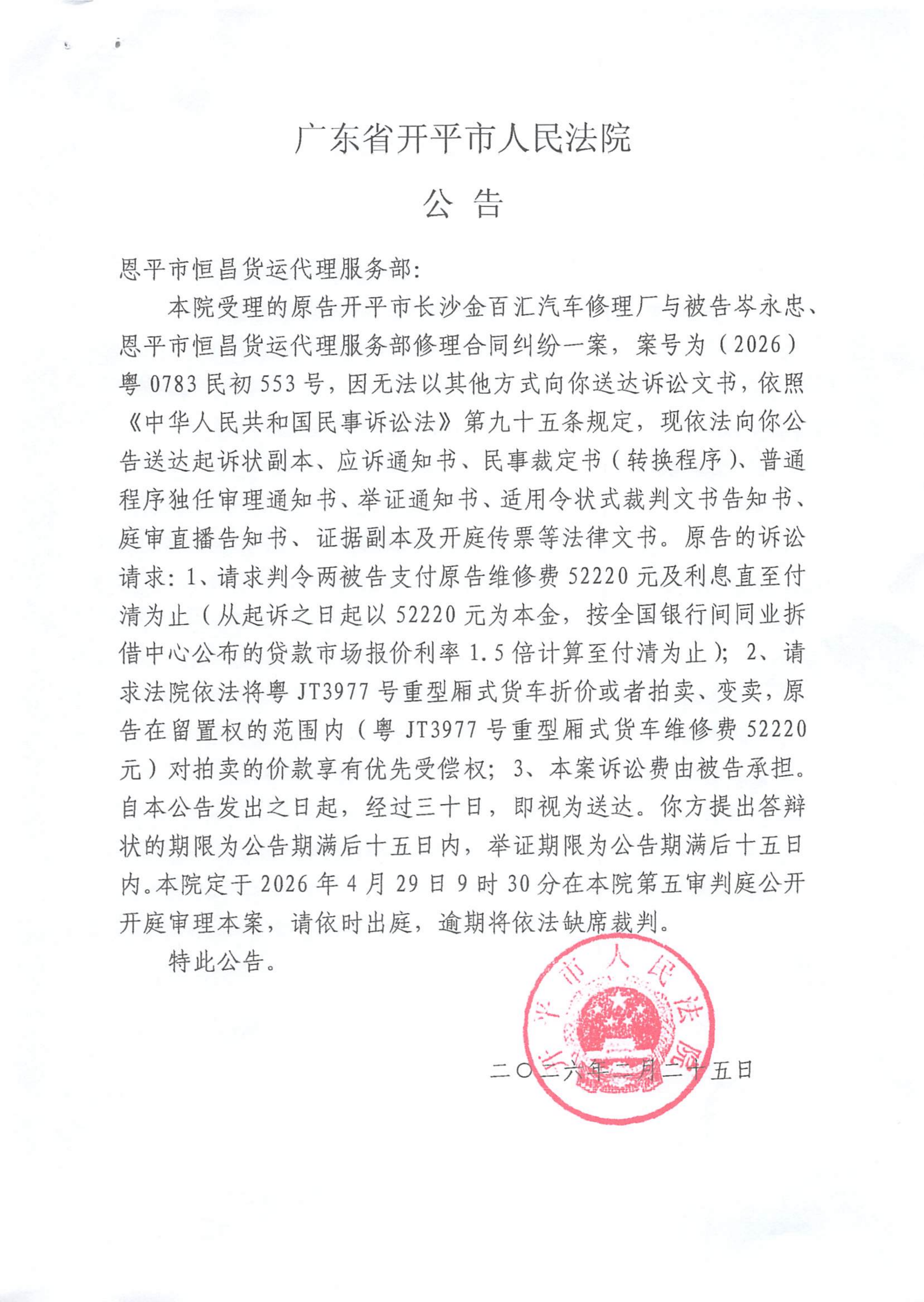 附件:(2026)粤0783民初553号 恩平市恒昌货运代理服务部 开庭公告.pdf