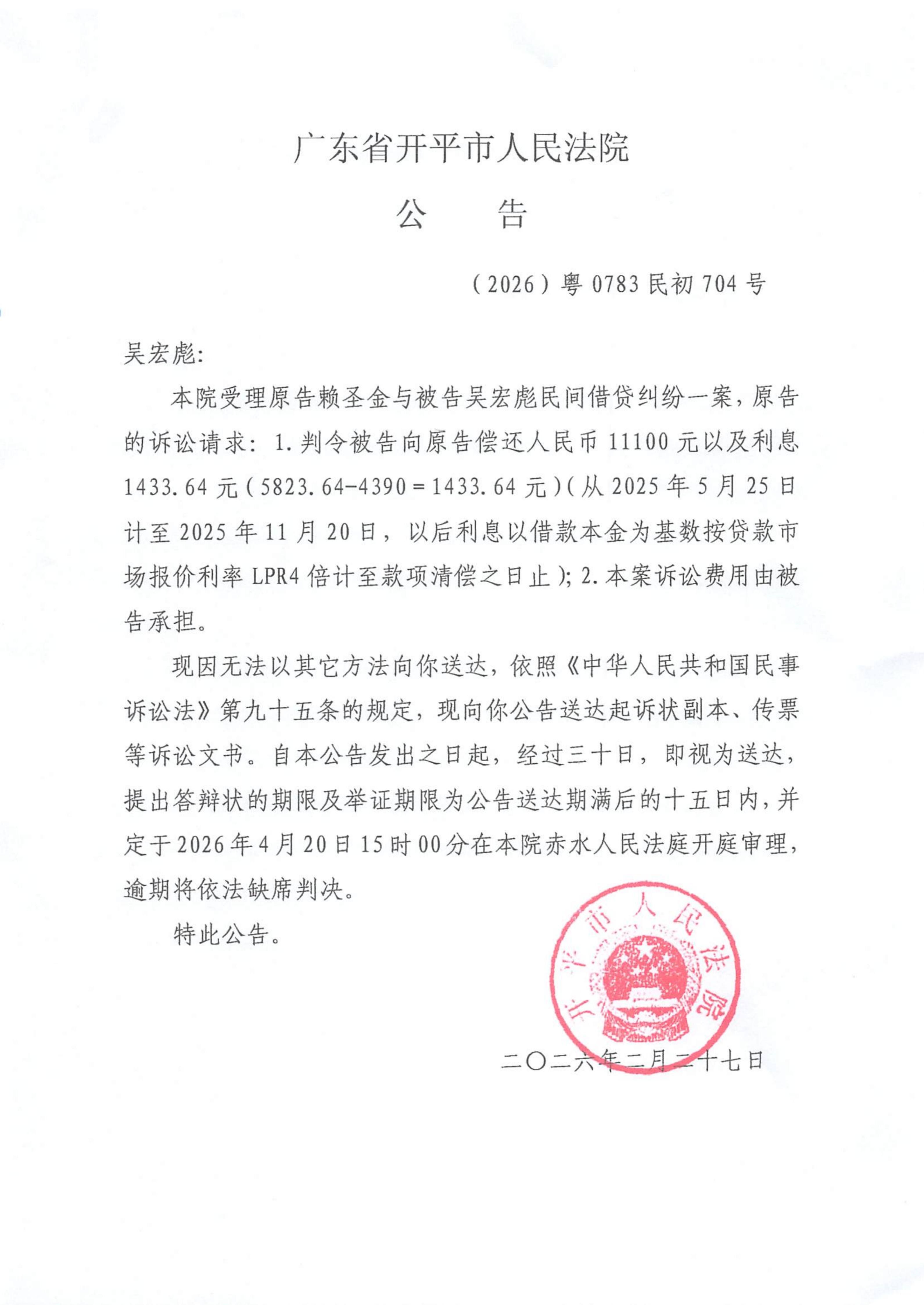 附件:(2026)粤0783民初704号 吴宏彪 开庭公告.pdf