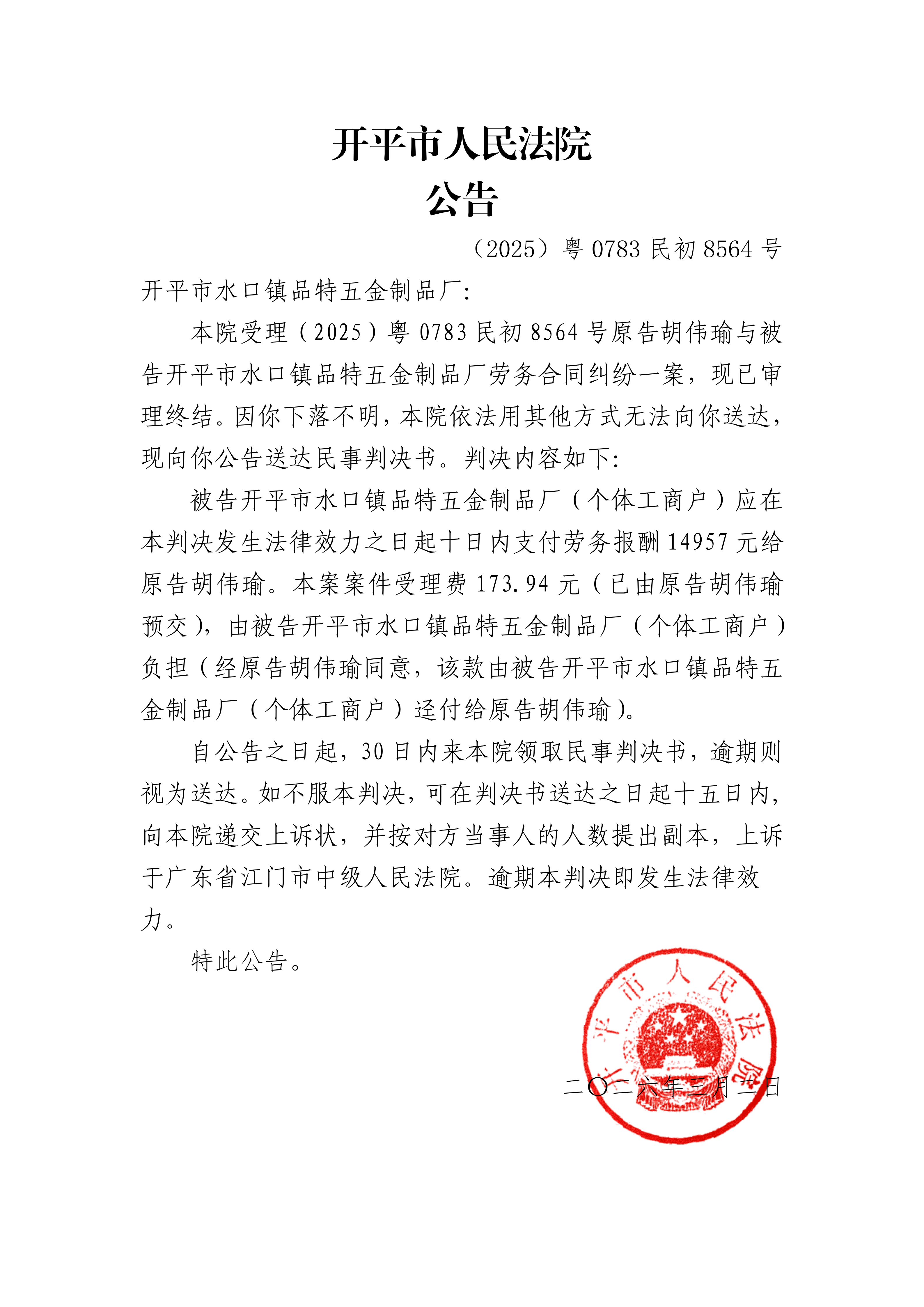 附件:(2025)粤0783民初8564号 开平市水口镇品特五金制品厂 判决公告.pdf