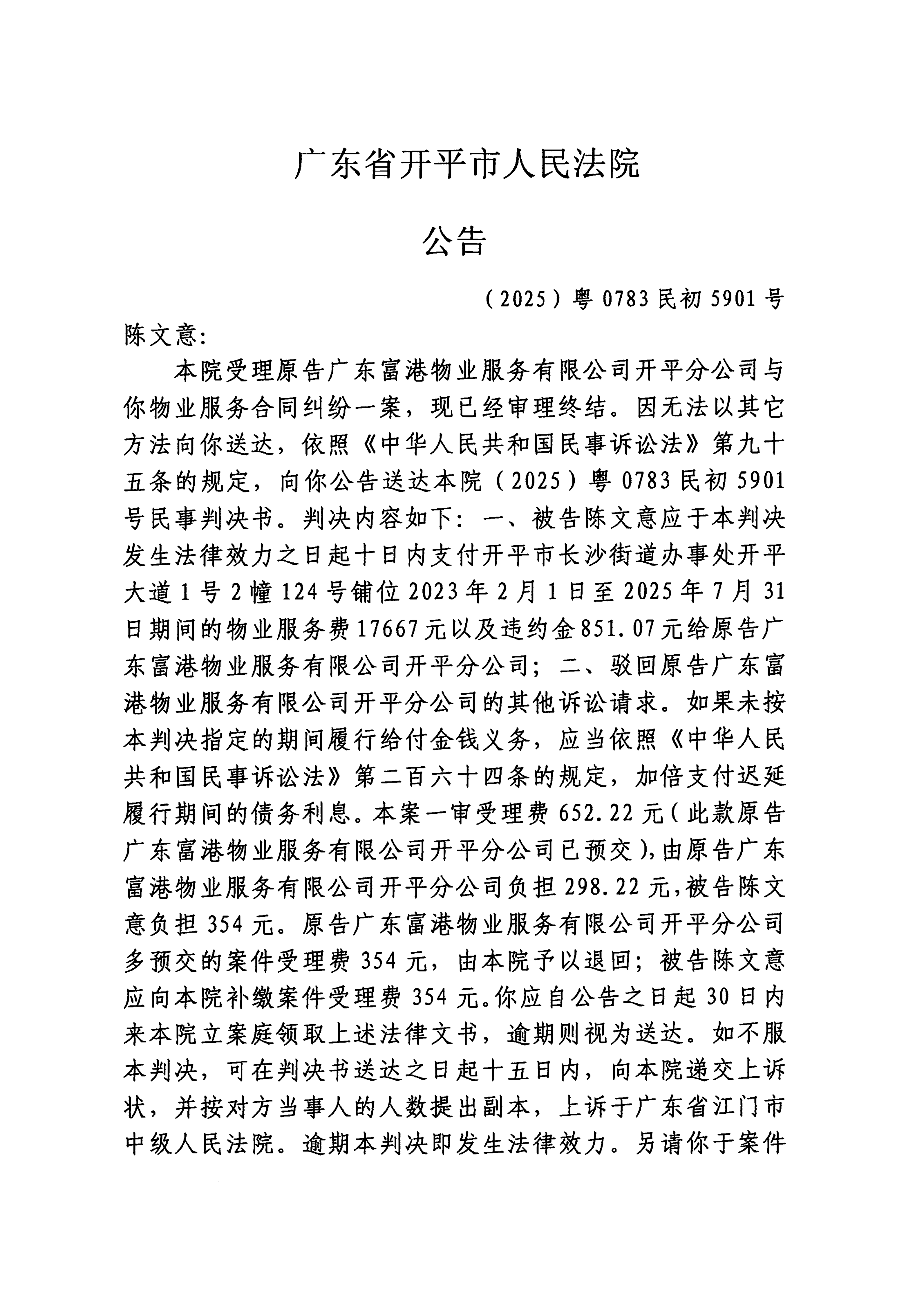 附件:(2025)粤0783民初5901号 陈文意 判决公告.pdf