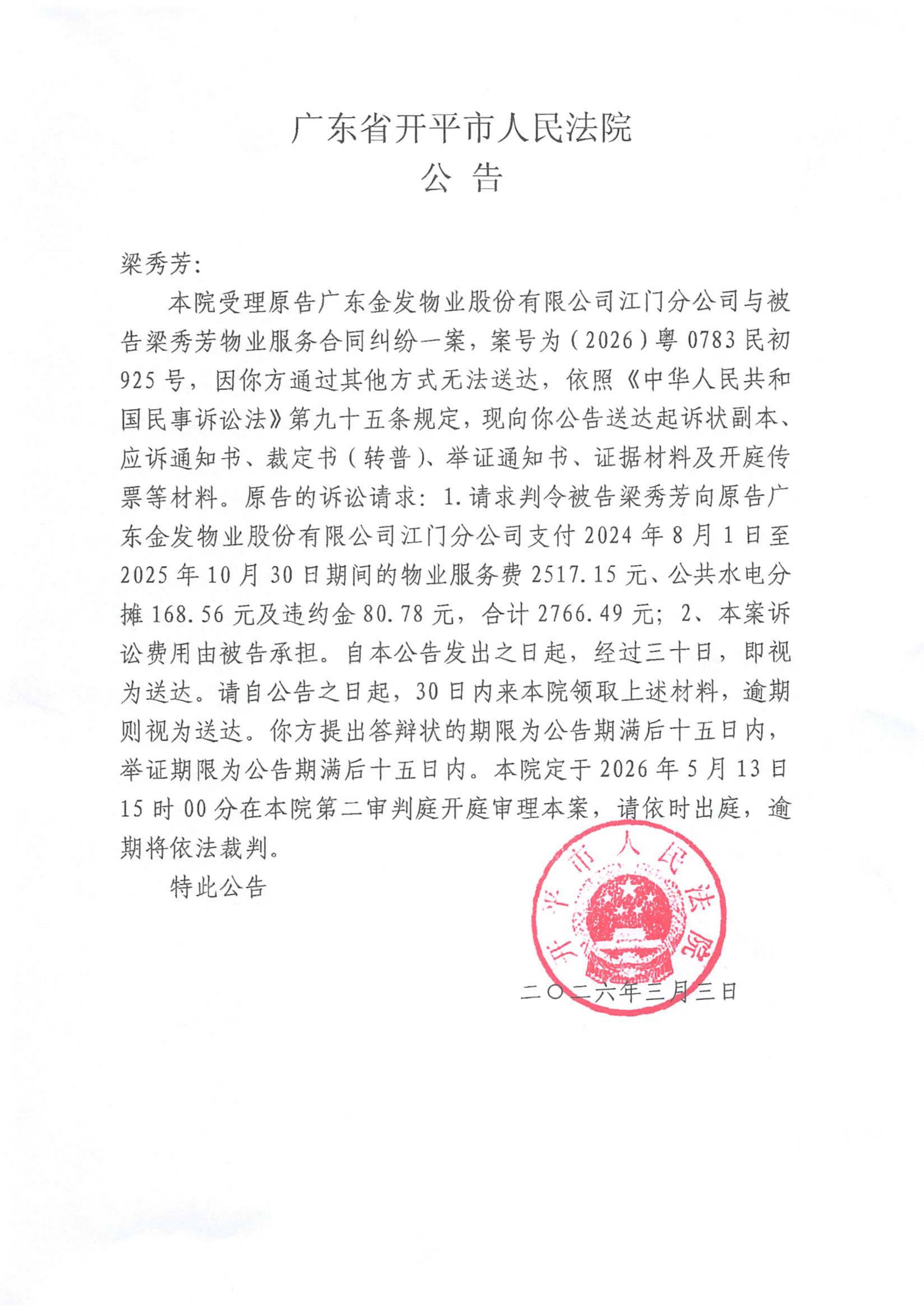 附件:(2026)粤0783民初925号 梁秀芳 开庭公告.pdf