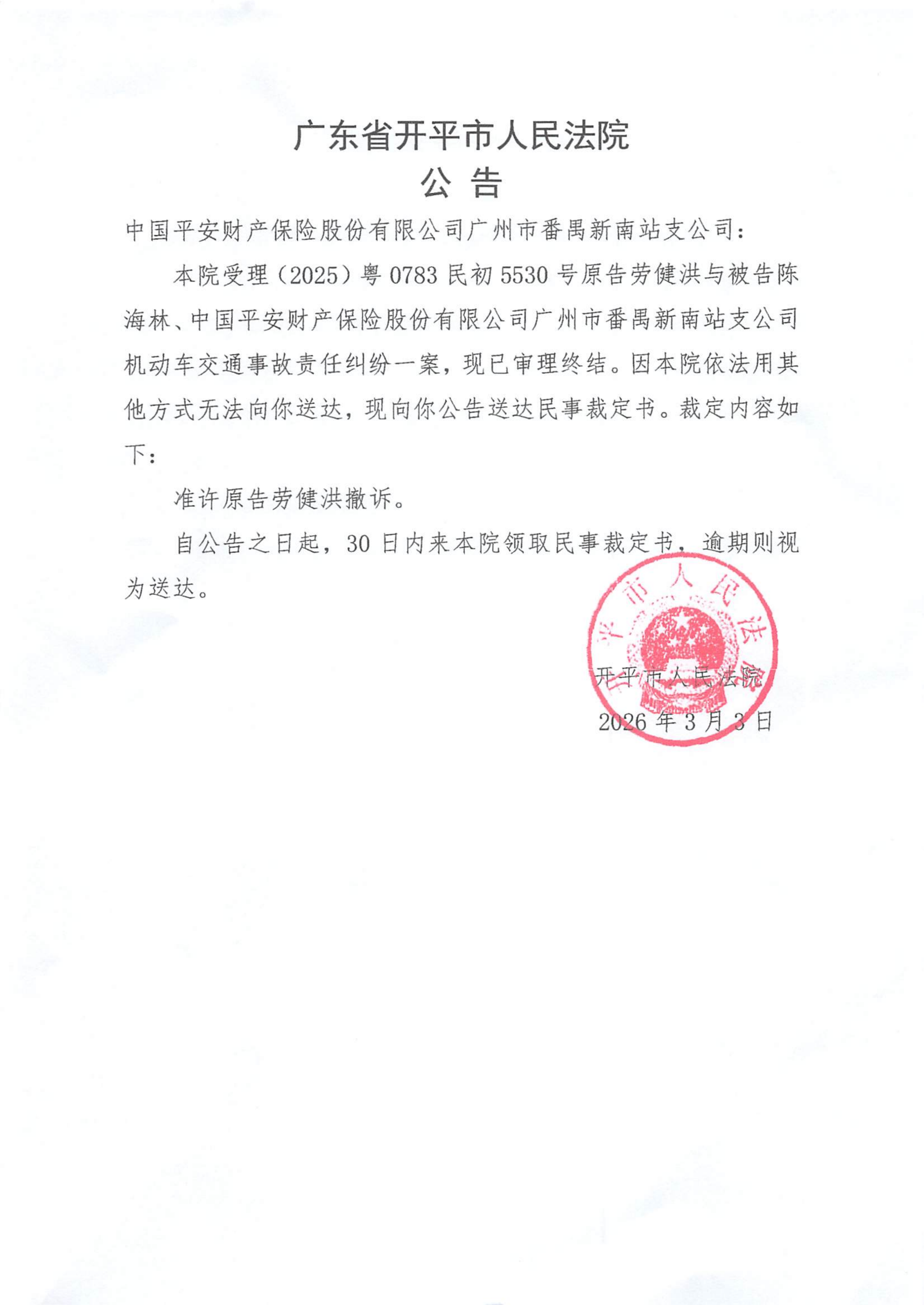 附件:(2025)粤0783民初5530号 中国平安财产保险股份有限公司广州市番禺新南站支公司 裁定公告.pdf