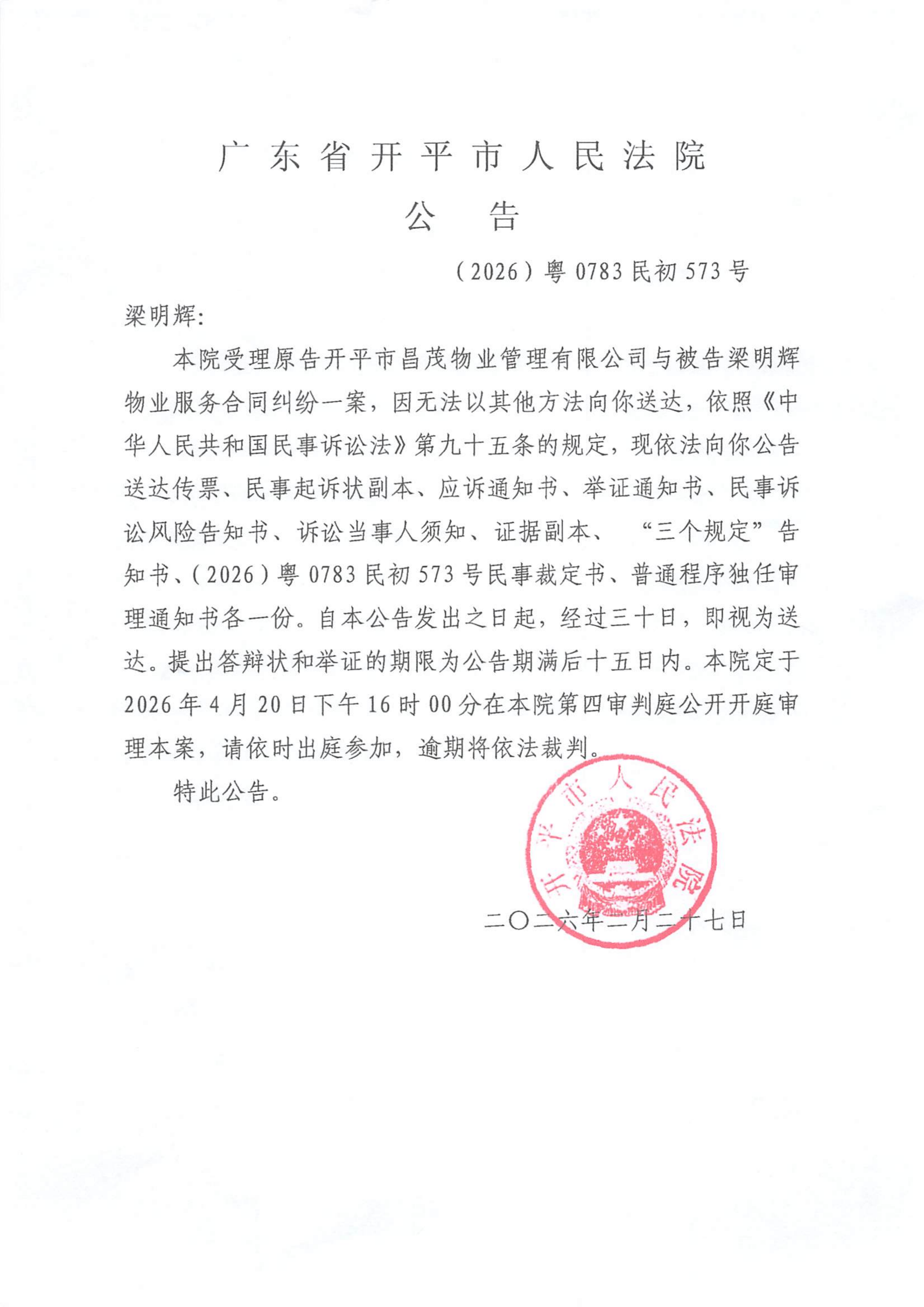 附件:(2026)粤0783民初573号 梁明辉 开庭公告.pdf