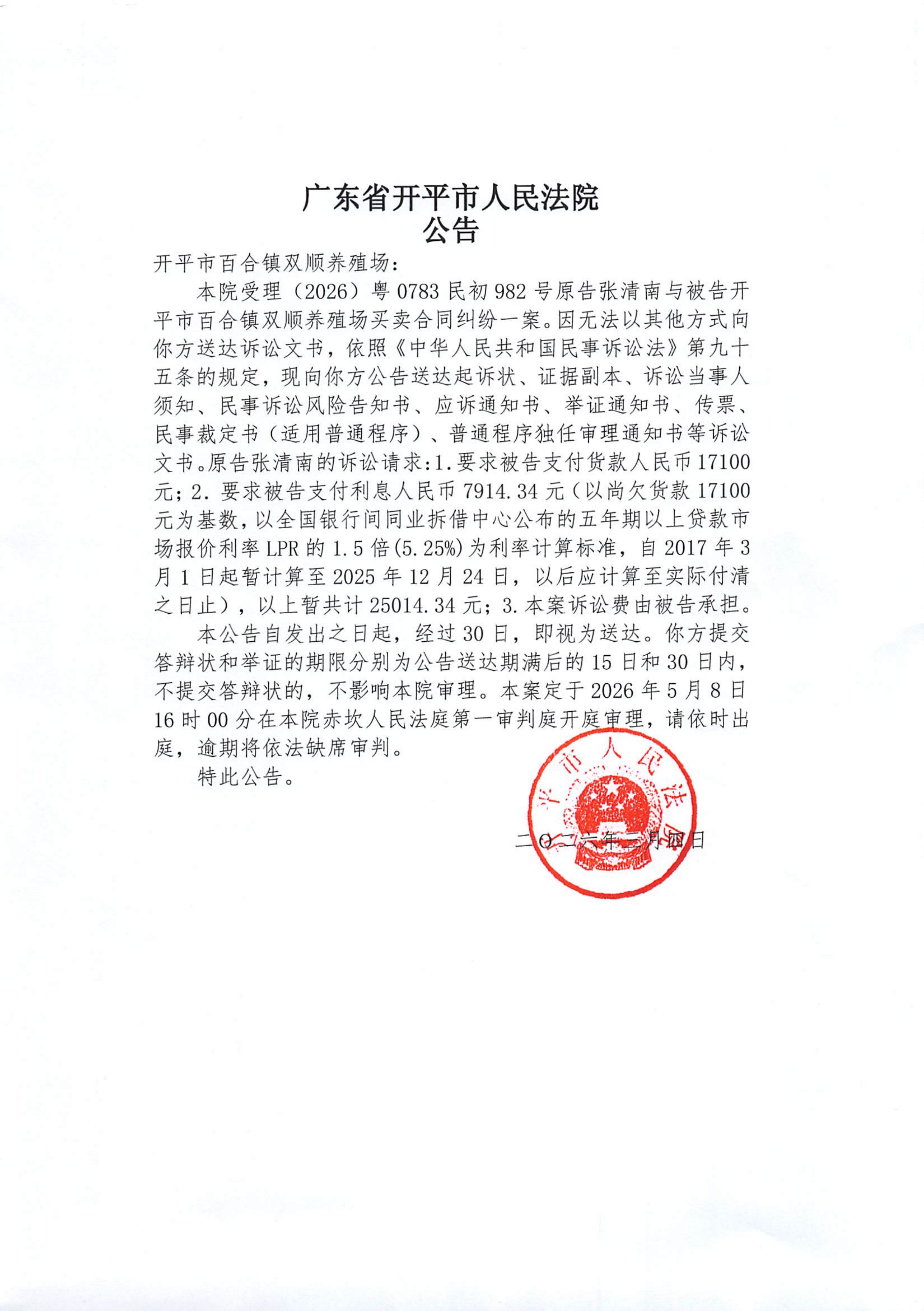附件:(2026)粤0783民初982号 开平市百合镇双顺养殖场 开庭公告.pdf
