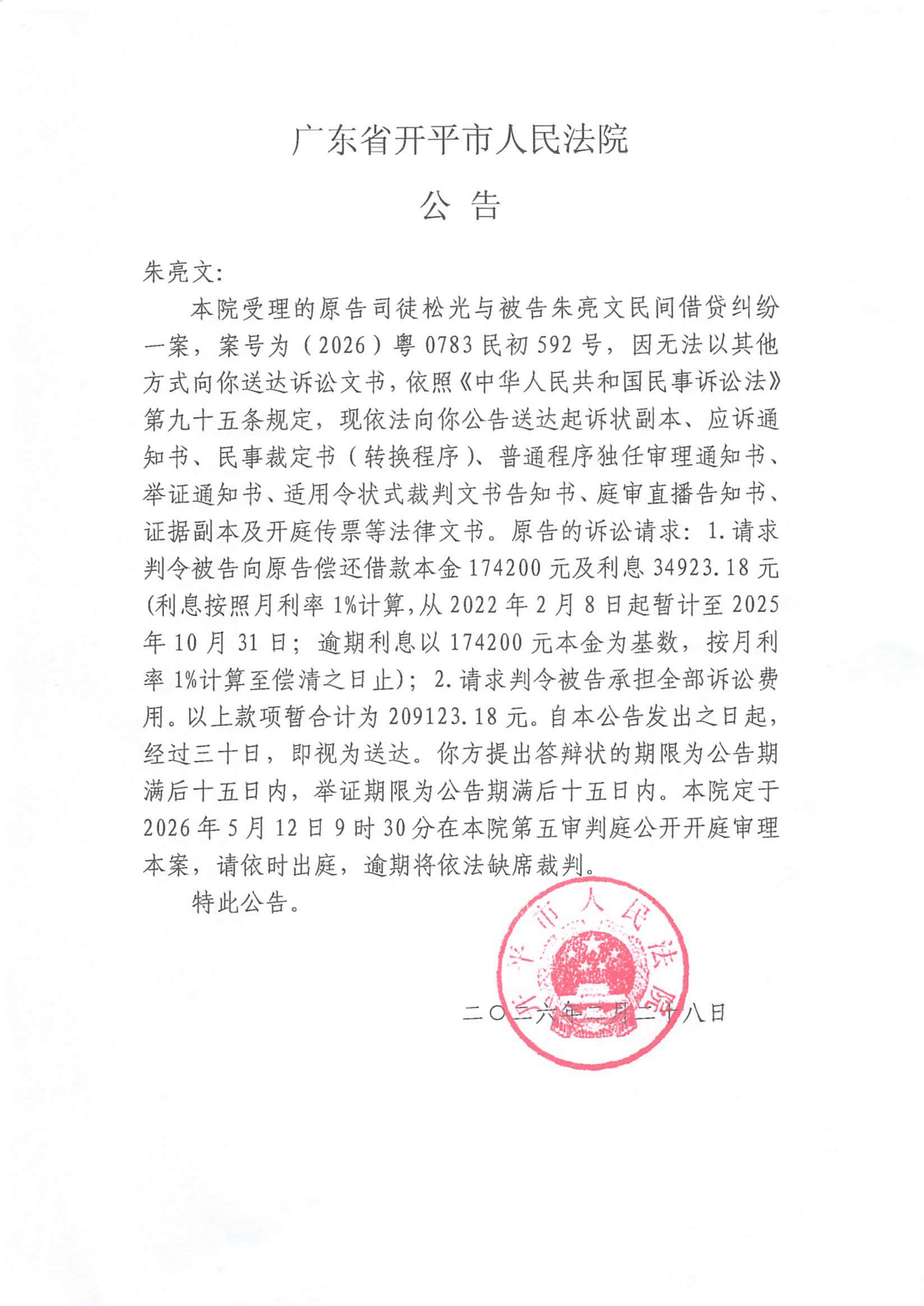 附件:(2026)粤0783民初592号 朱亮文 开庭公告.pdf
