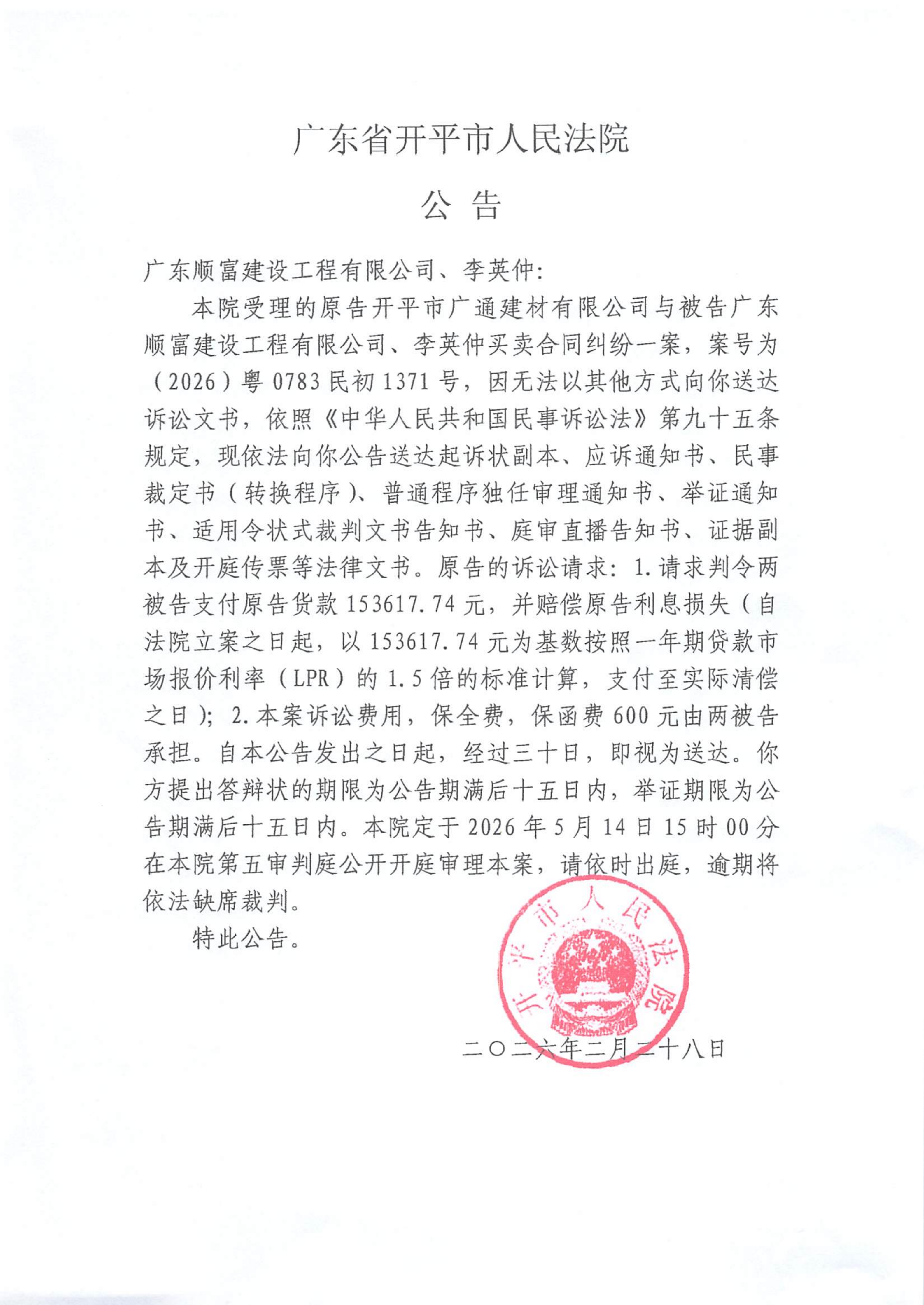 附件:(2026)粤0783民初1371号 广东顺富建设工程有限公司、李英仲 开庭公告.pdf