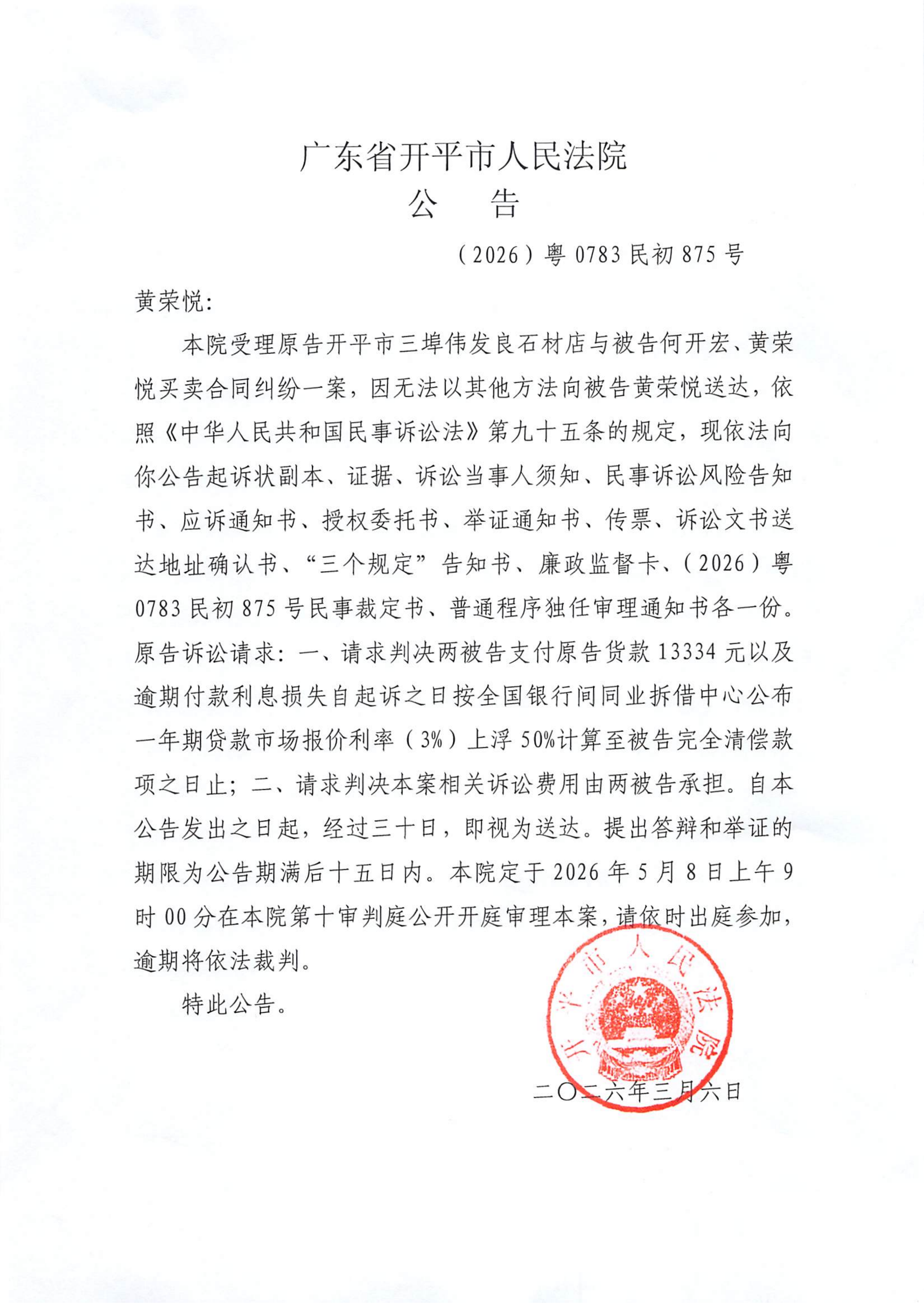 附件:(2026)粤0783民初875号 黄荣悦 开庭公告.pdf
