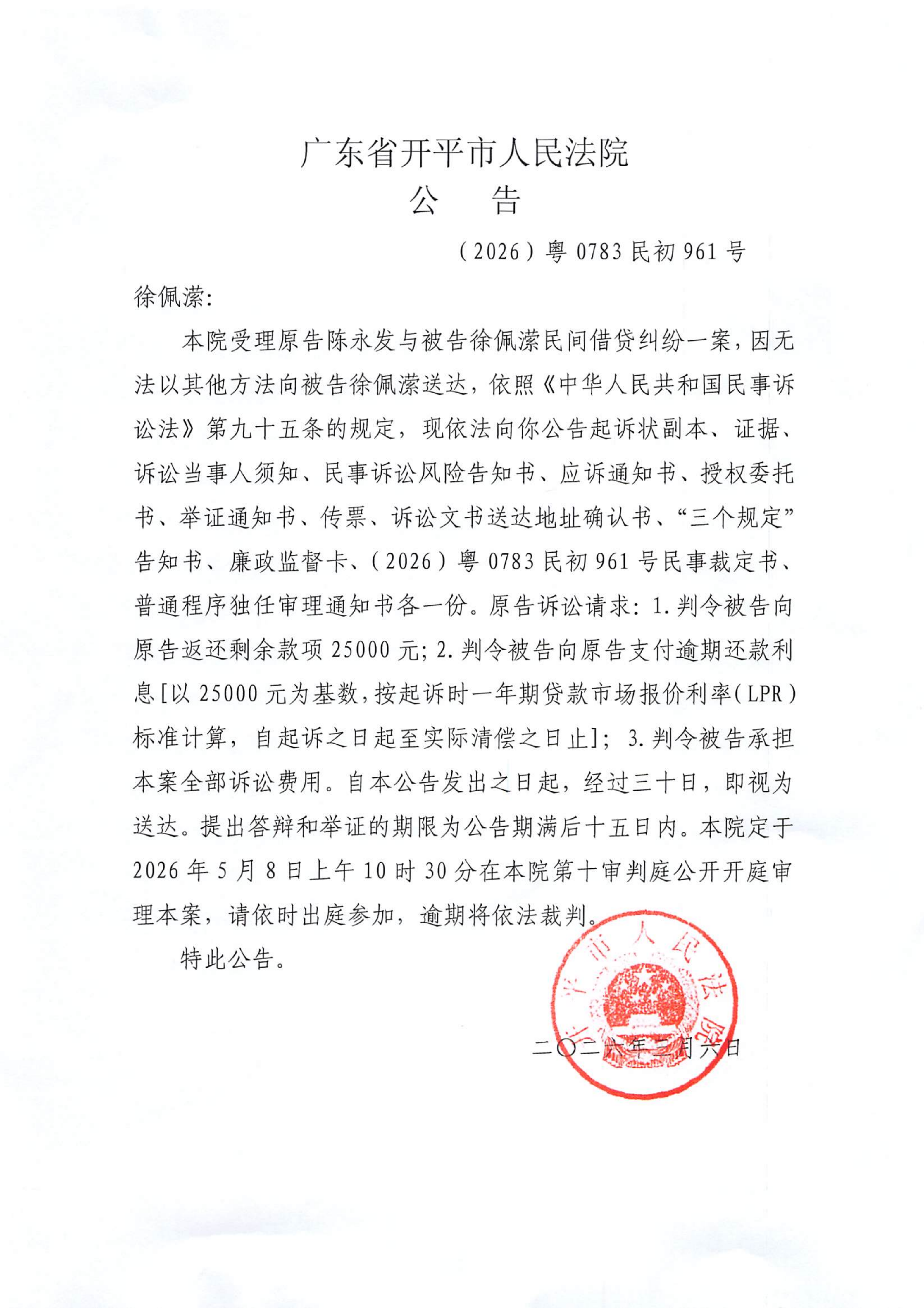 附件:(2026)粤0783民初961号 徐佩潆 开庭公告.pdf