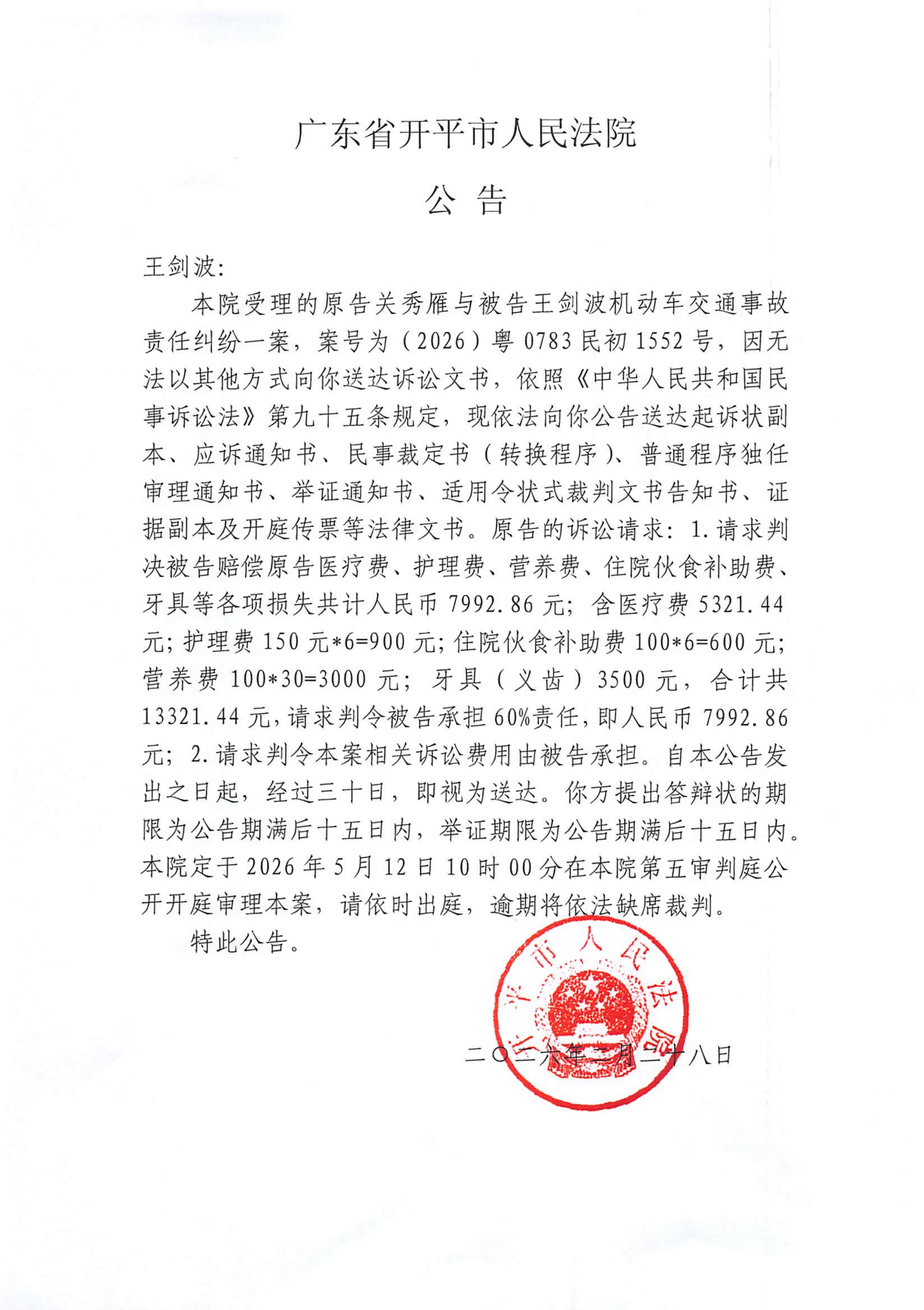附件:(2026)粤0783民初1552号 王剑波 开庭公告.pdf