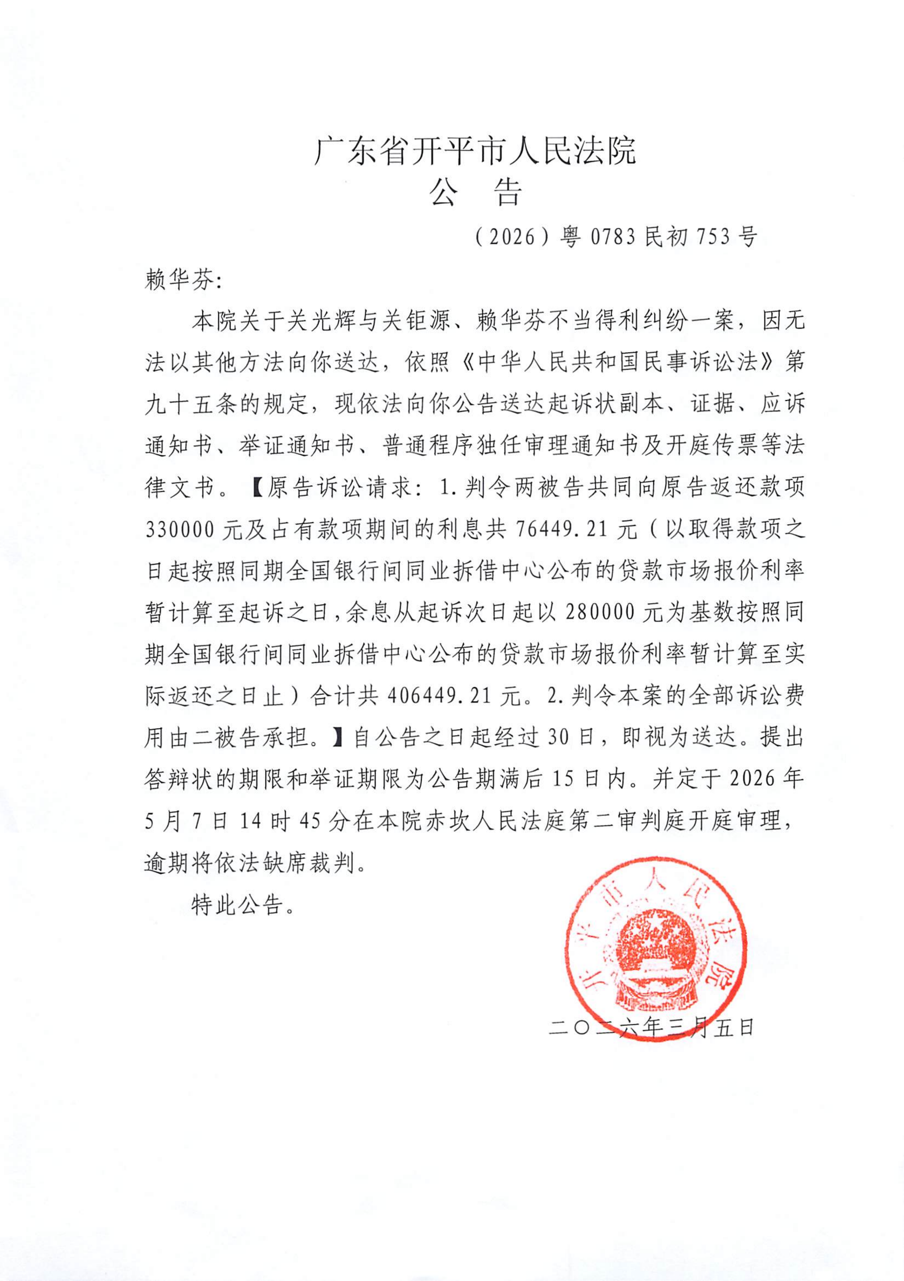 附件:(2026)粤0783民初753号 赖华芬 开庭公告.pdf