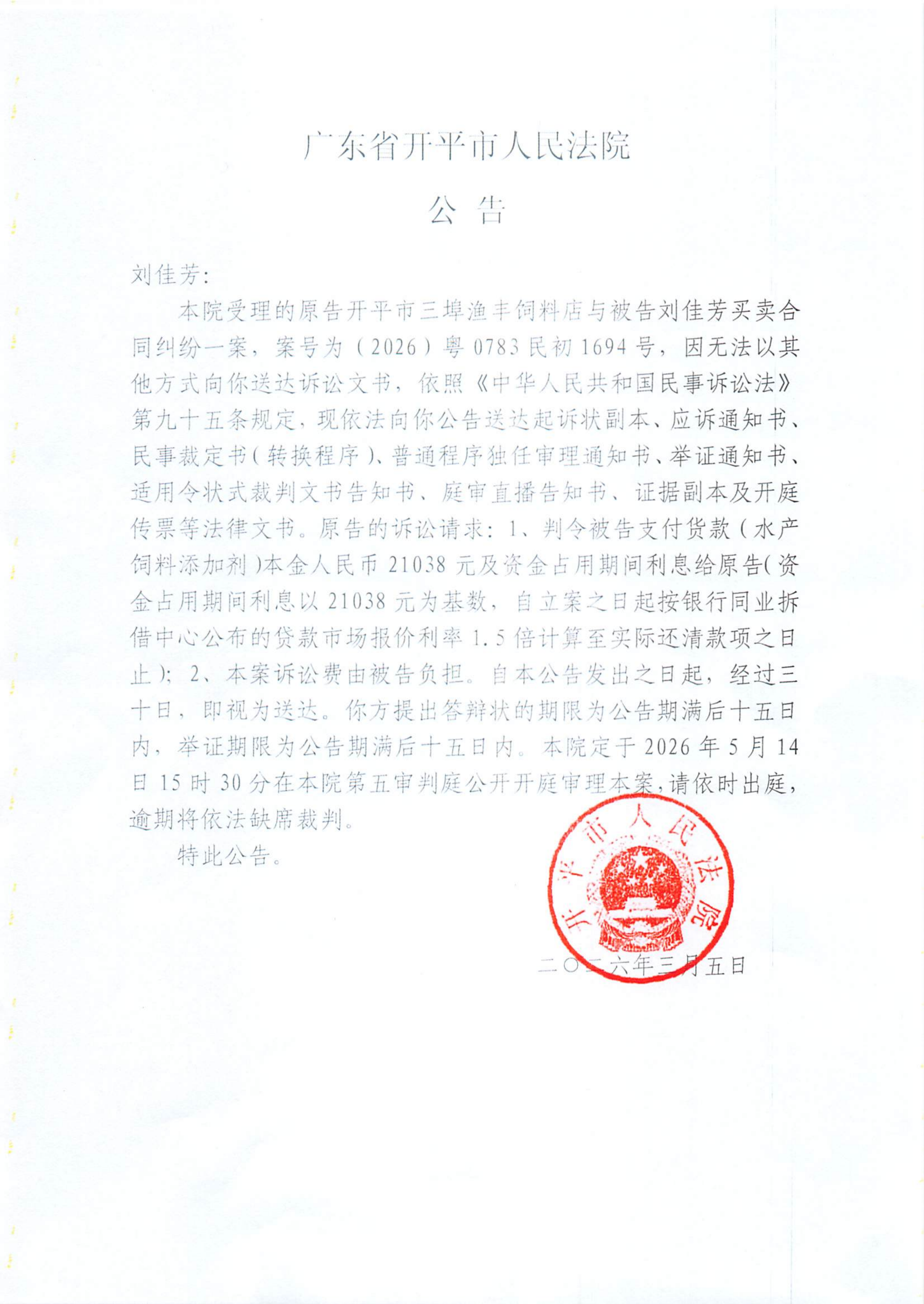附件:(2026)粤0783民初1694号 刘佳芳 开庭公告.pdf