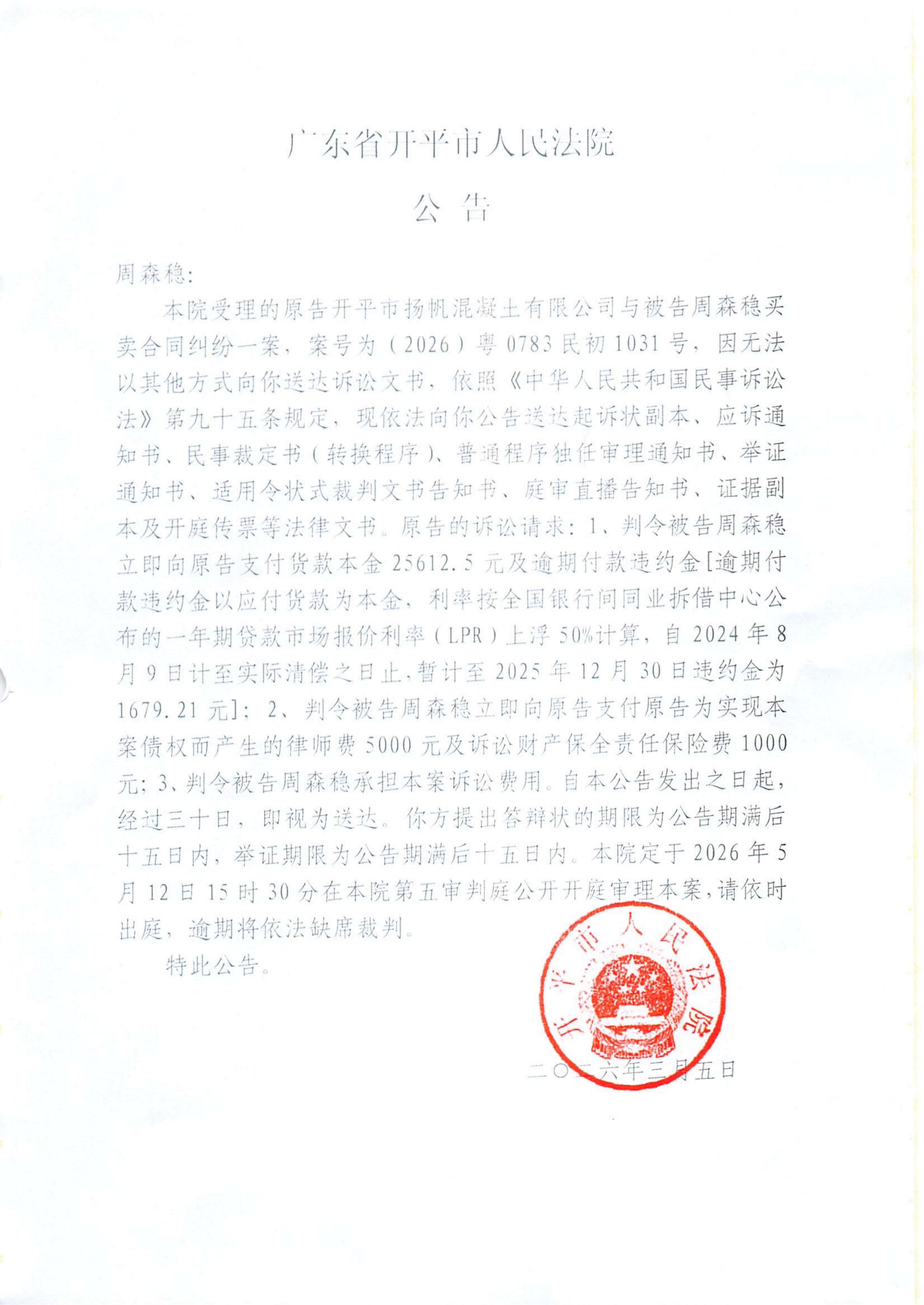 附件:(2026)粤0783民初1031号 周森稳 开庭公告.pdf