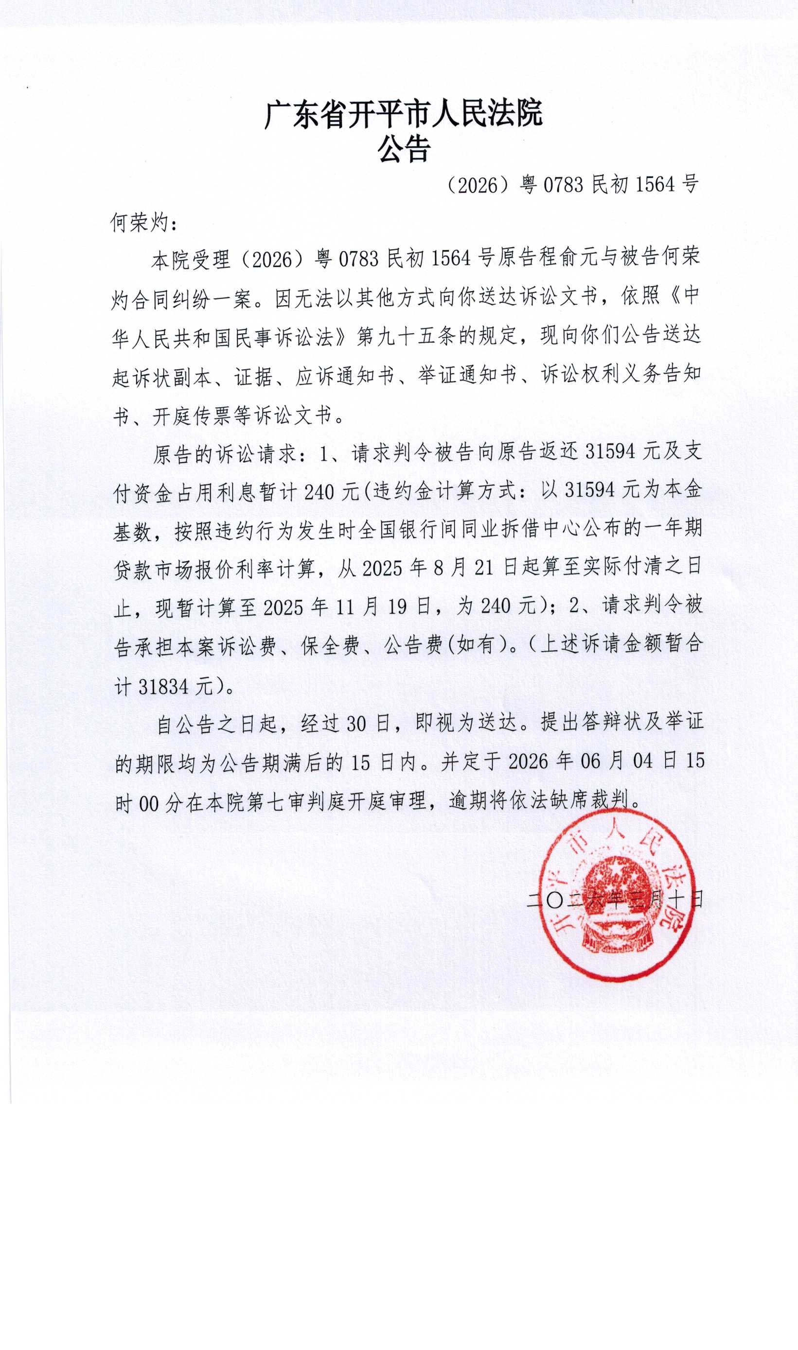 (2026)粤0783民初1564号 何荣灼 应诉公告.pdf