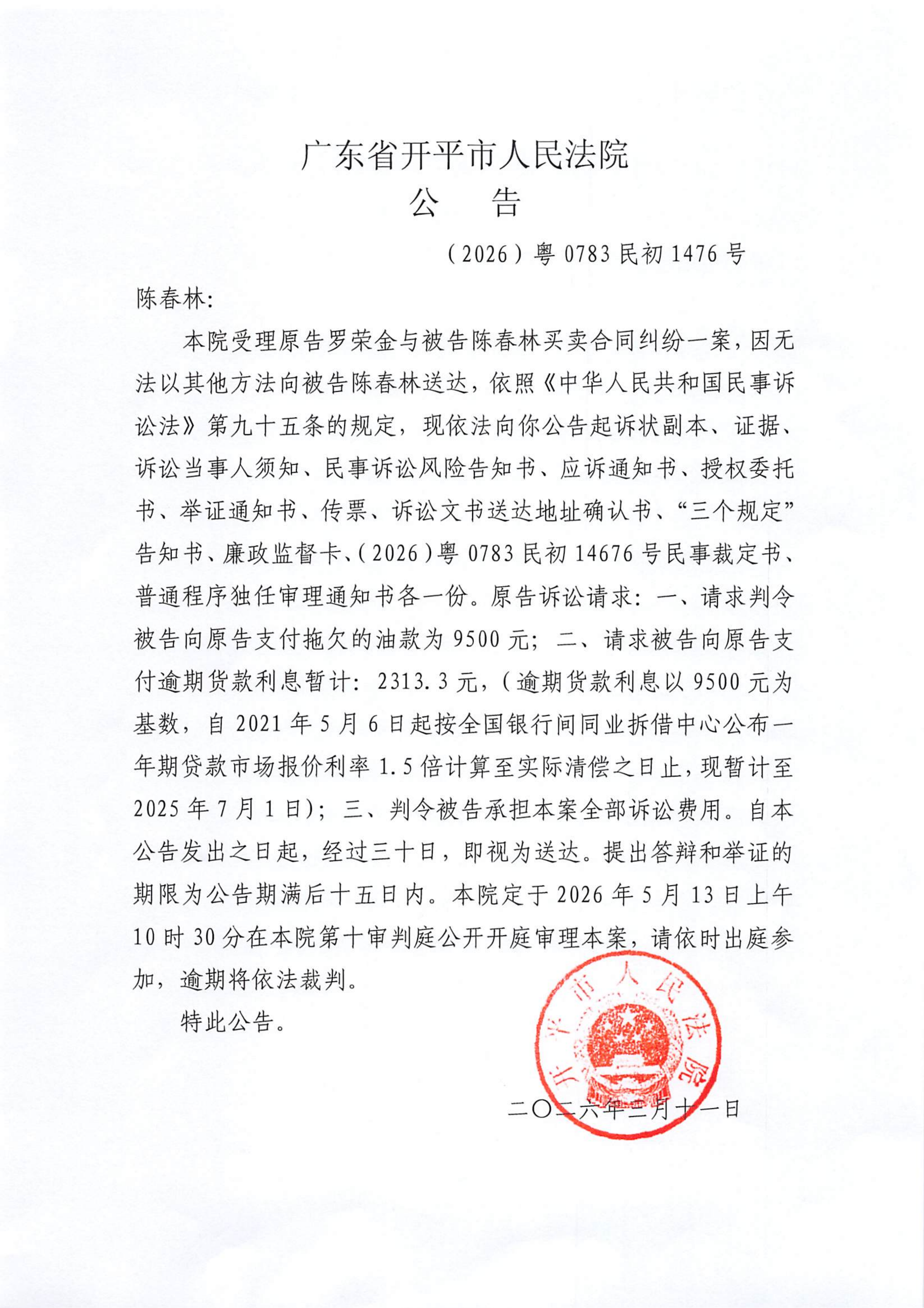 附件:(2026)粤0783民初1476号 陈春林 开庭公告.pdf