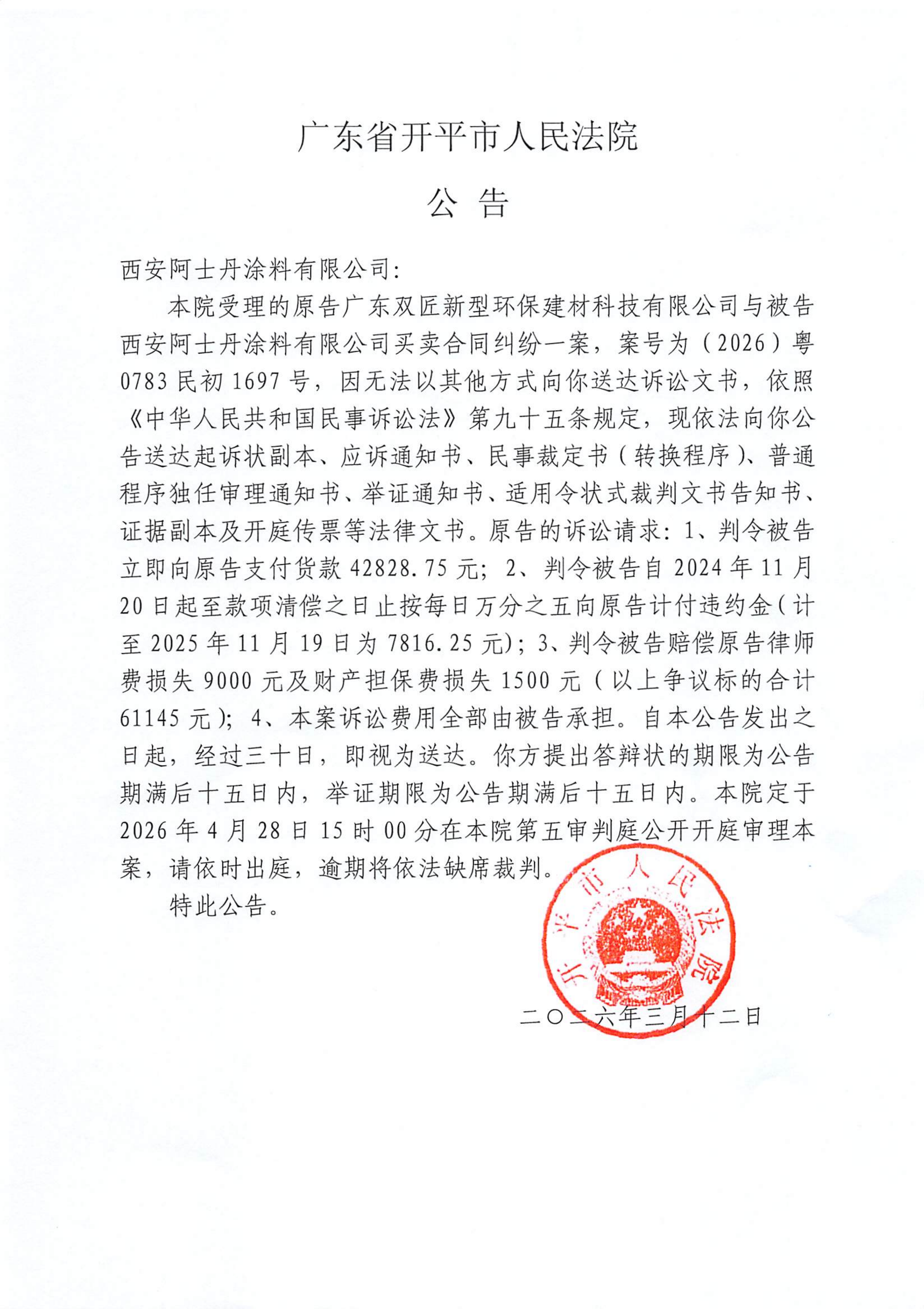 附件:(2026)粤0783民初1697号 西安阿士丹涂料有限公司 开庭公告.pdf