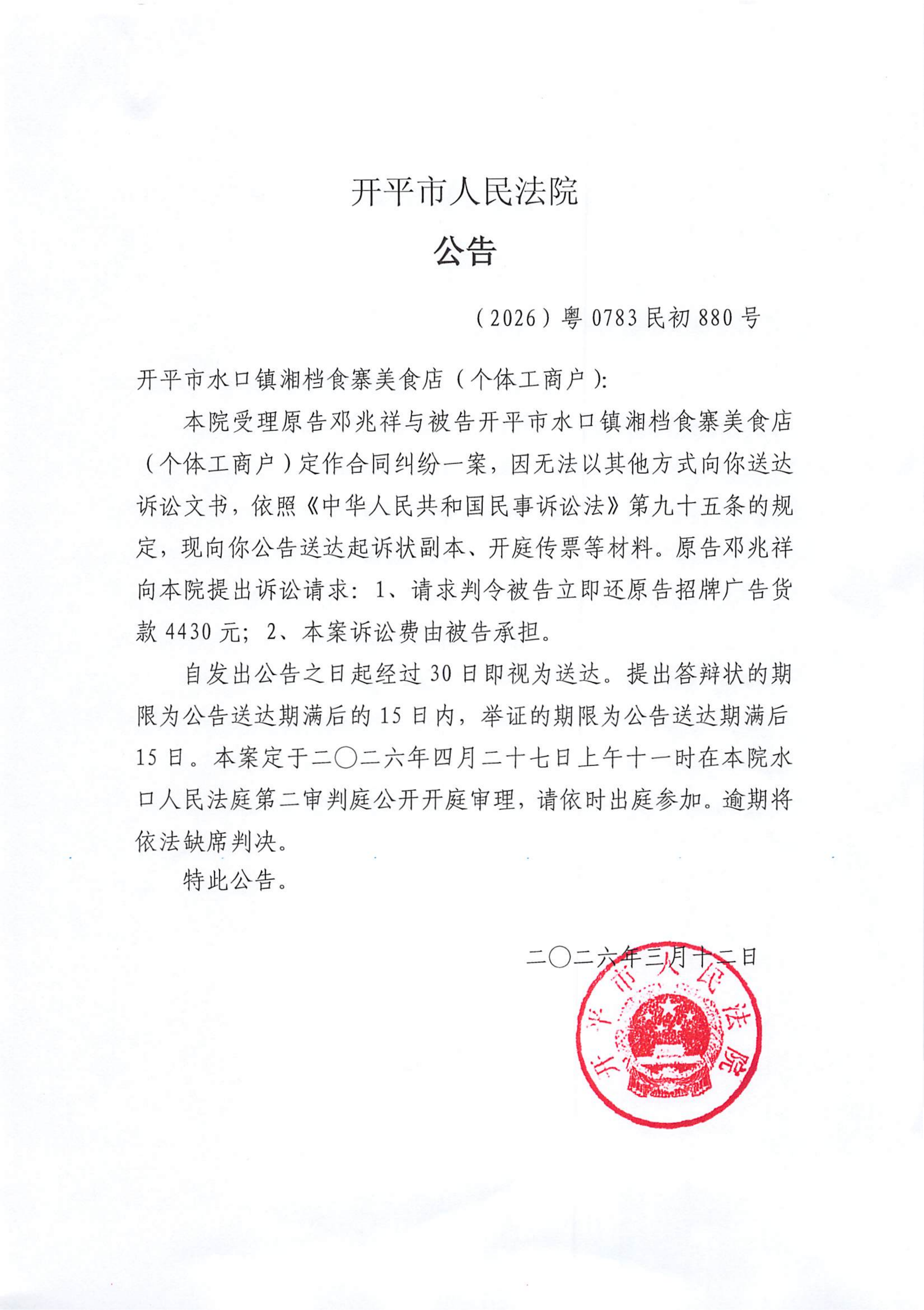 附件:(2026)粤0783民初880号 开平市水口镇湘档食寨美食店(个体工商户) 开庭公告.pdf