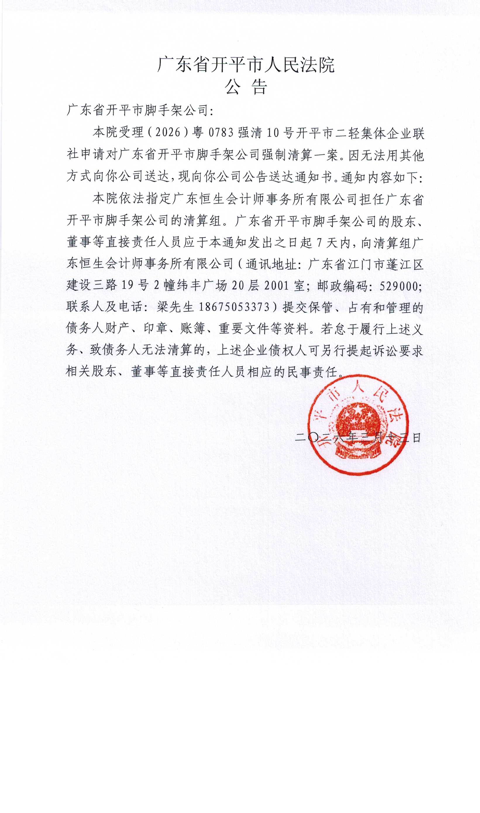 主办:开平市人民法院 网址: www.kpcourt.gov.cn 地址:广东省开平市沿江东路82号开平市人民法院 邮编:529300
