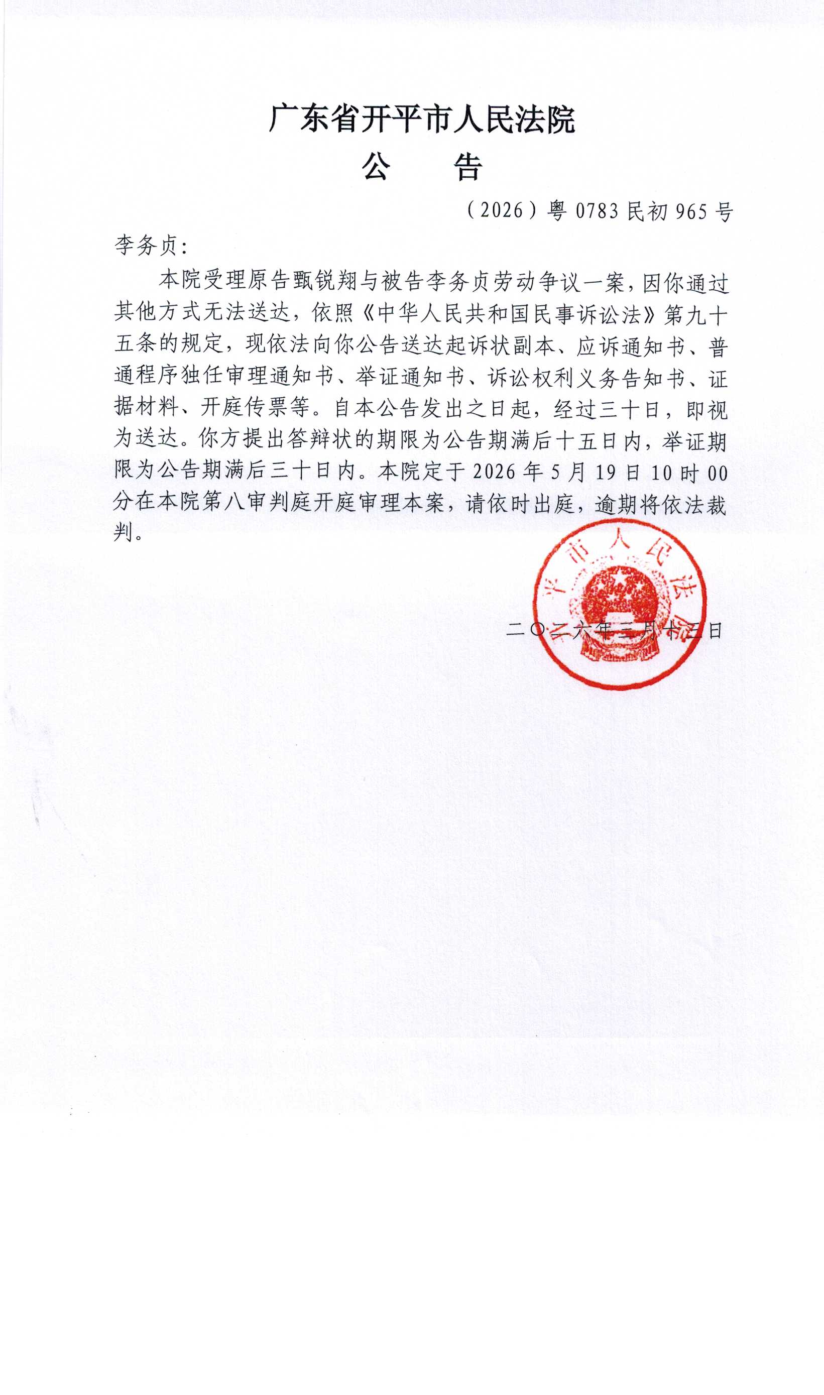 (2026)粤0783民初965号李务贞传票公告