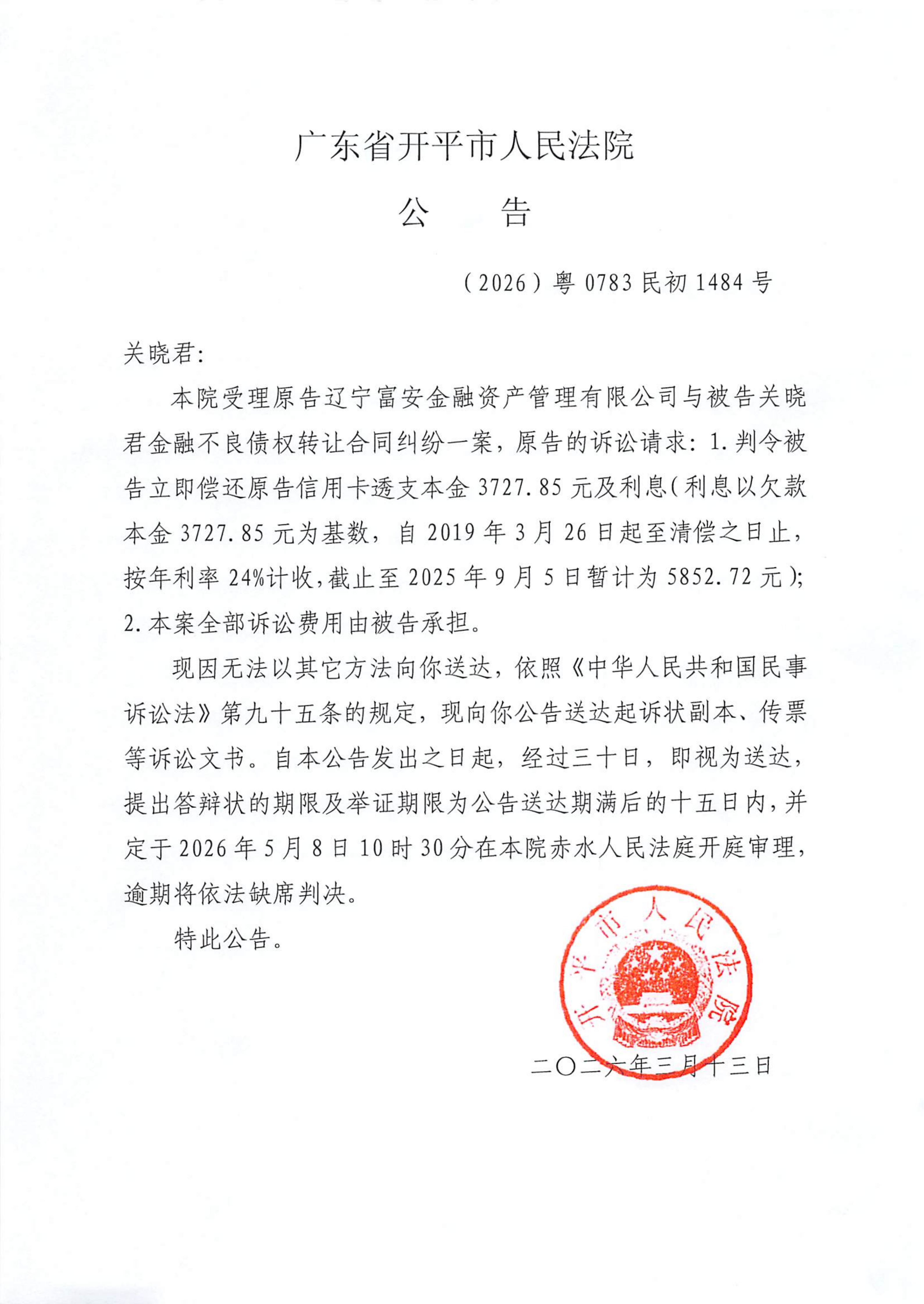 附件:(2026)粤0783民初1484号 关晓君 开庭公告.pdf